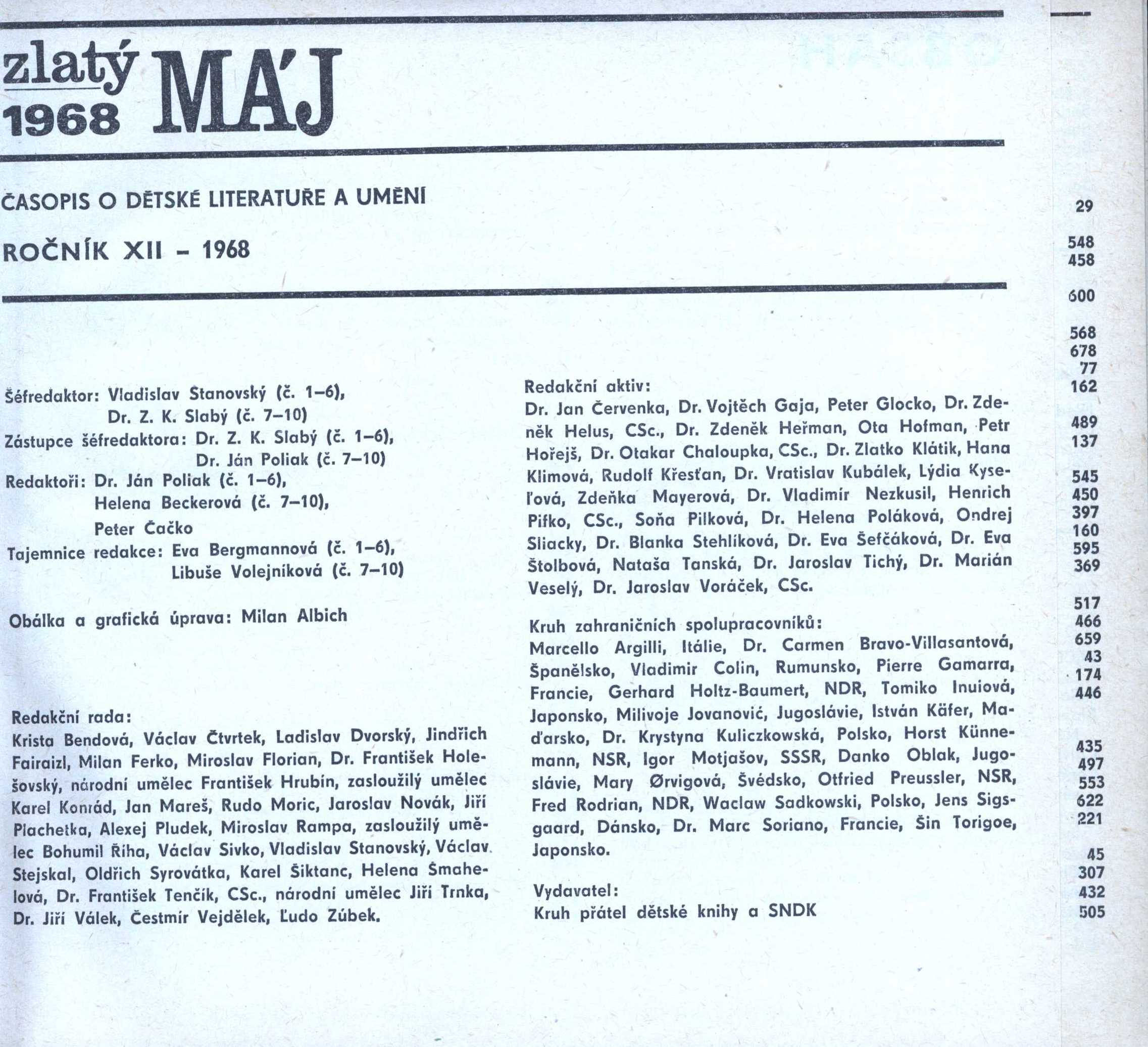 Title information Zlatý máj : časopis o dětské literatuře a umění Další autoři Stanovský, Vladislav, 1922-2005 (Editor) Slabý, Zdeněk Karel, 1930-2020 (Editor) Poliak, Ján, 1929-1977 (Editor) Čačko, Peter, 1936- (Editor) Albich, Milan, 1925-2000 (Bookjacket designer) (Book designer) Corporation Kruh přátel dětské knihy (Publisher) Státní nakladatelství dětské knihy (Publisher) Roč., číslo ročník 12, číslo 1-10, 1968 Publication Praha : SNDK : Kruh přátel dětské knihy, 1968 Scope il. ISSN 0044-4871 Country Czech Republic Language Czech * Slovak Note Čb. ilustrace a fotografie. -- Číslo 6 je společným číslem s časopisem "Detskaja literatura". -- Český a slovenský text. -- Cizojazyčná resumé. -- Od čísla 7 v tiráži uvedeno rovněž průběžné číslování od začátku vydávání, čísla 7-10 jsou v průběžném číslování označena 134-137