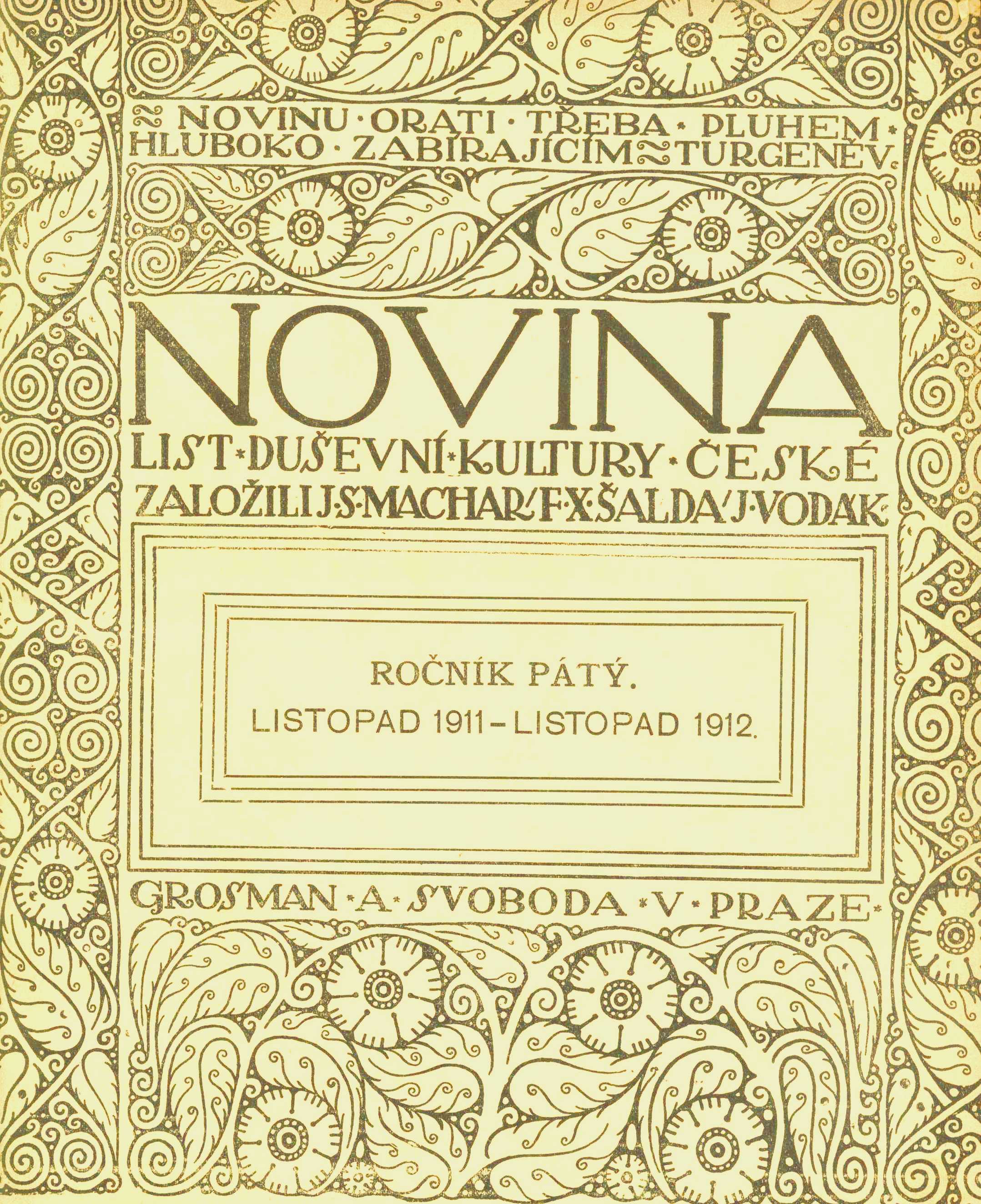 Title information Novina : list duševní kultury české Další autoři Šalda, F. X., 1867-1937 (Editor) Leschinger, Eduard, 1858-1945 (Printer) Corporation Grosman a Svoboda (nakladatelství) (Publisher) Edvard Leschinger (firma) (Printer) Roč., číslo Ročník 5, číslo 1-24, 1911-1912 Publication V Praze : Grosman a Svoboda, 1911-1912 Tiskem Ed. Leschingra Scope 762 stran : 23 cm ISSN 1803-9693 Country Czech Republic Language Czech Note 1-24 (listopad 1911 - listopad 1912)