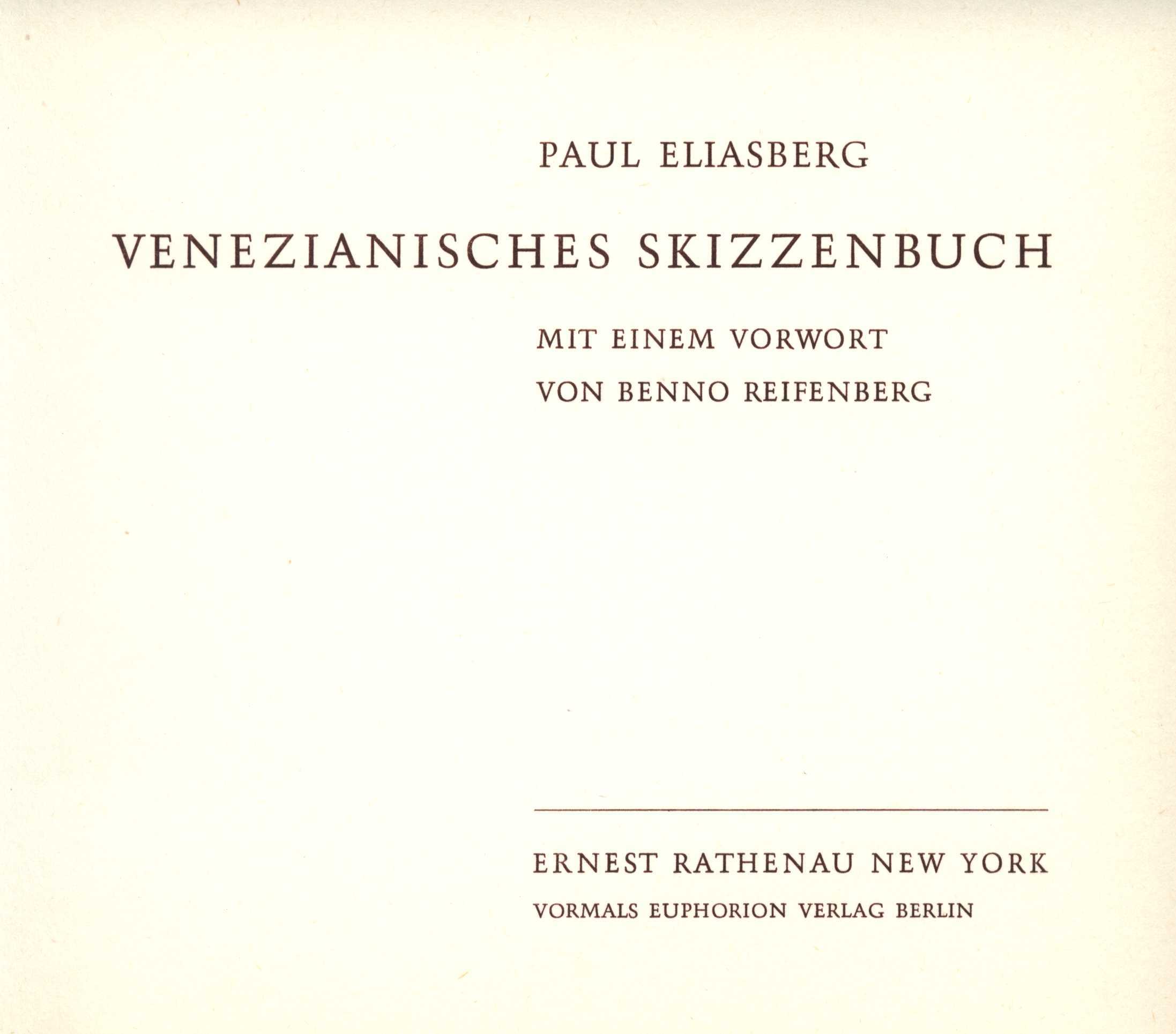 Title information Venezianisches Skizzenbuch / / Paul Eliasberg ; mit einem Vorwort von Benno Reifenberg Personal name Eliasberg, Paul, 1907-1983 (Illustrator) Další autoři Reifenberg, Benno, 1892-1970 (Author of introduction) Publication New York : Ernst Rathenau ; Berlin : Euphorion, c1969 Scope [[8] s., [26] l. obr. příl. : il. Country Germany Language German Note Hnědobílé celostránkové kresby.