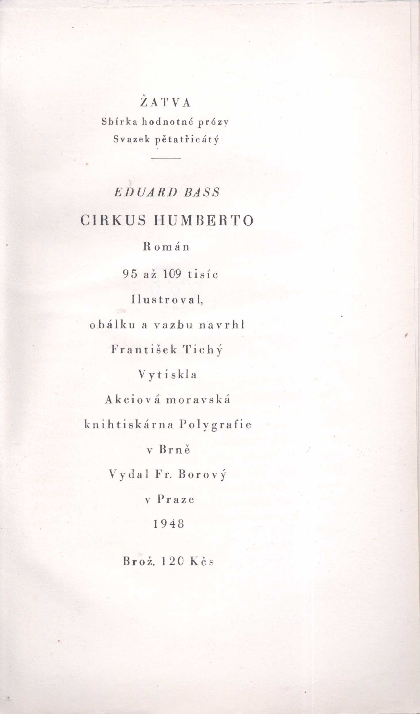 Title information Cirkus Humberto : román / Eduard Bass ; [ilustroval, obálku a vazbu navrhl František Tichý] Personal name Bass, Eduard, 1888-1946 (Author) Další autoři Tichý, František, 1896-1961 (Illustrator) (Bookjacket designer) (Binding designer) Corporation Fr. Borový (firma) (Publisher) Akciová moravská knihtiskárna Polygrafie (Printer) Publication Praha : Fr. Borový, 1948 Manufacture Akciová moravská knihtiskárna Polygrafie) Scope 631 s., [16] obr. příl. ; 8° ISBN brož. Edition Žatva : sbírka hodnotné prózy sv. 35