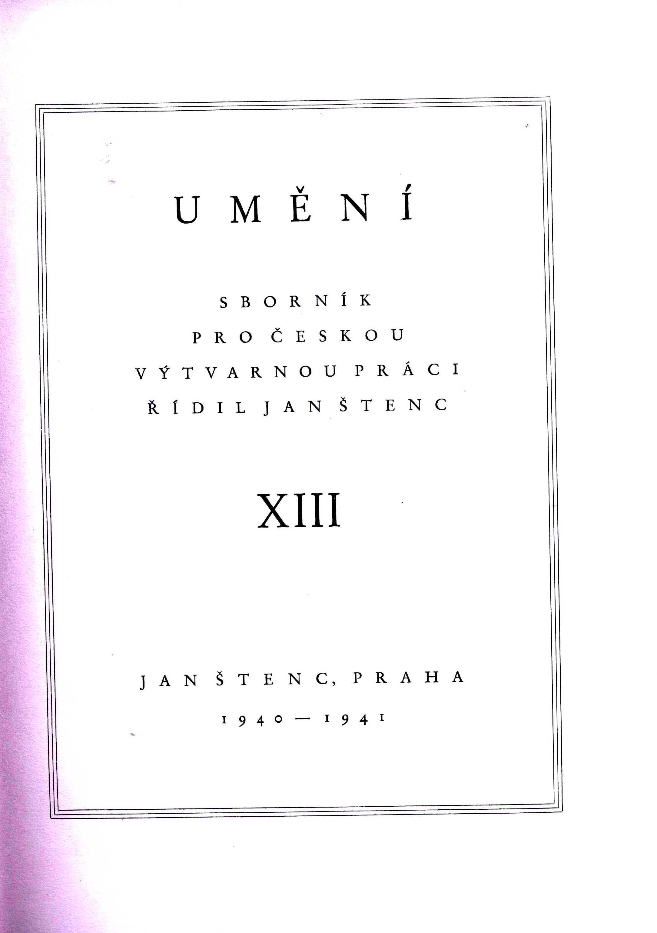 Title information Umění : sborník pro českou výtvarnou práci Další autoři Štenc, Jan, 1871-1947 (Publishing director) (Publisher) Corporation Jan Štenc (nakladatelství, tiskárna) (Publisher) Roč., číslo Ročník 13, číslo 1-10, 1940/1941 Publication Praha : Jan Štenc, 1940-1941 Scope 432 stran : fotografie, faksimile ; 27 cm Country Czech Republic Language Czech Note Barevná zdobená obálka Maxe Švabinského. - Černobílé ilustrace. - Faksimile. - Obsahuje černobílé přílohy zahrnuté do paginace.