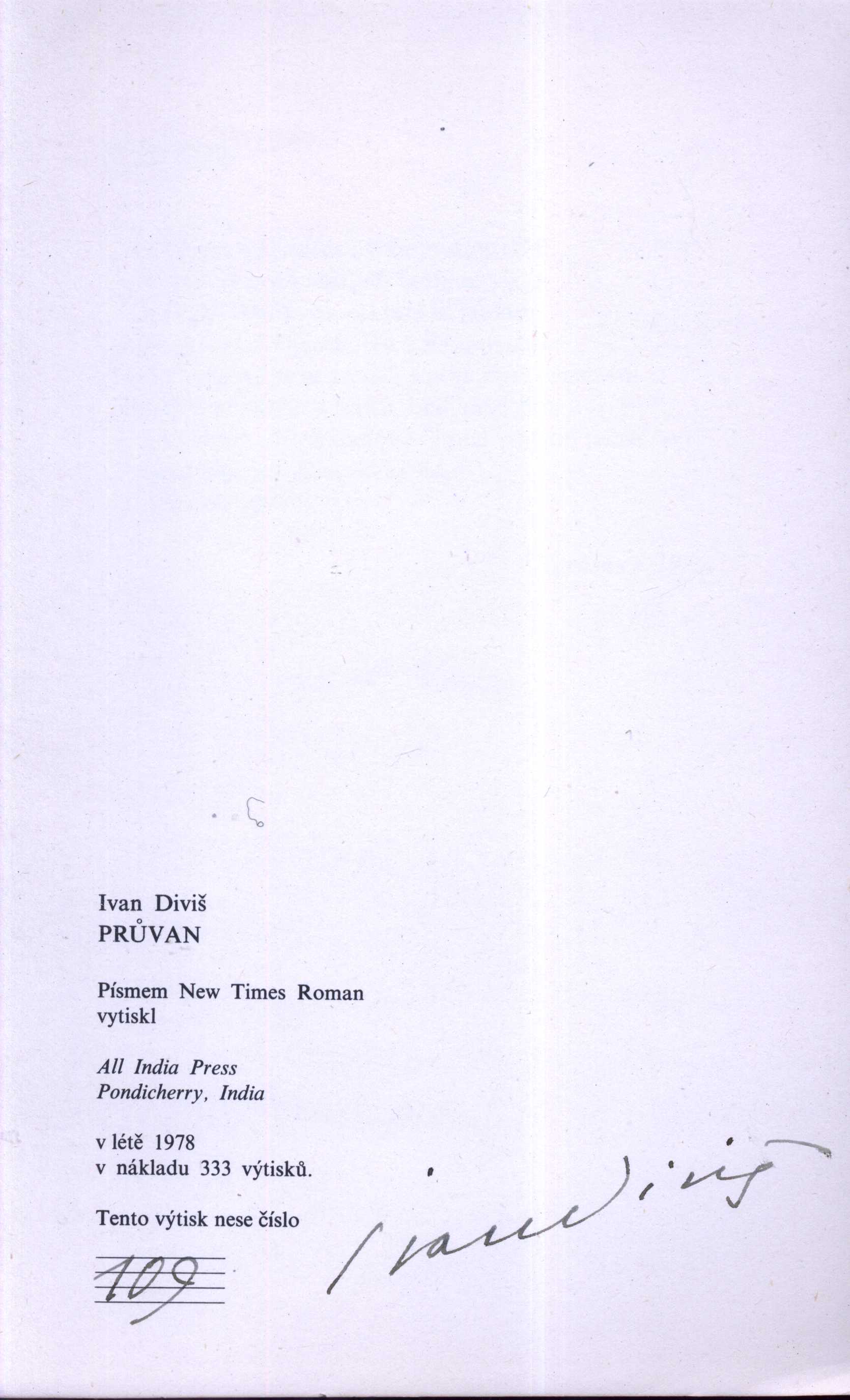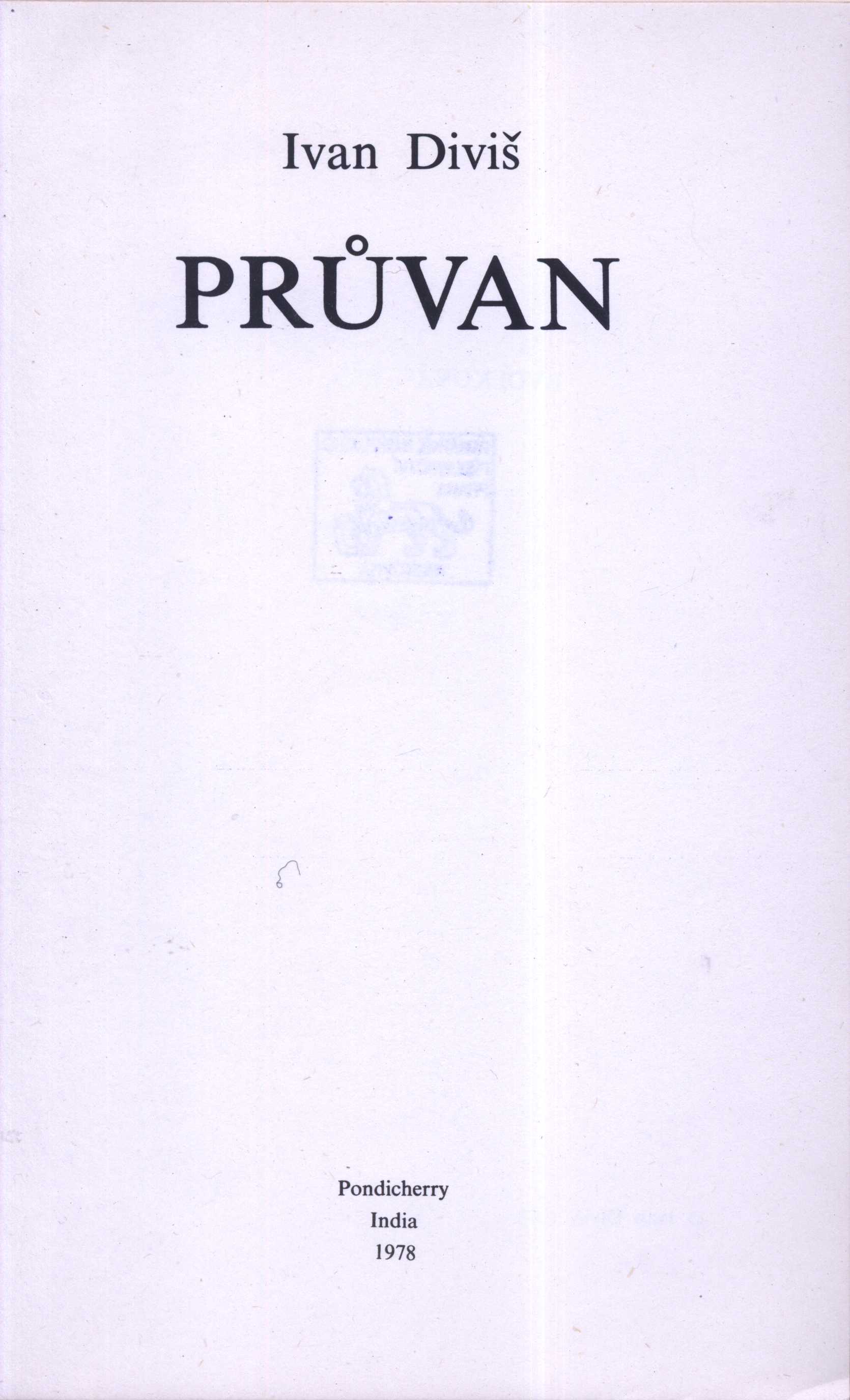 Title information Průvan / Ivan Diviš Personal name Diviš, Ivan, 1924-1999 (Author) Další autoři Jadrný, Karel, 1946- (Publisher) Scope 42 stran ; 23 cm ISBN (Volné listy) Country India Language Czech Note Vydáno 333 bibliofilských výtisků