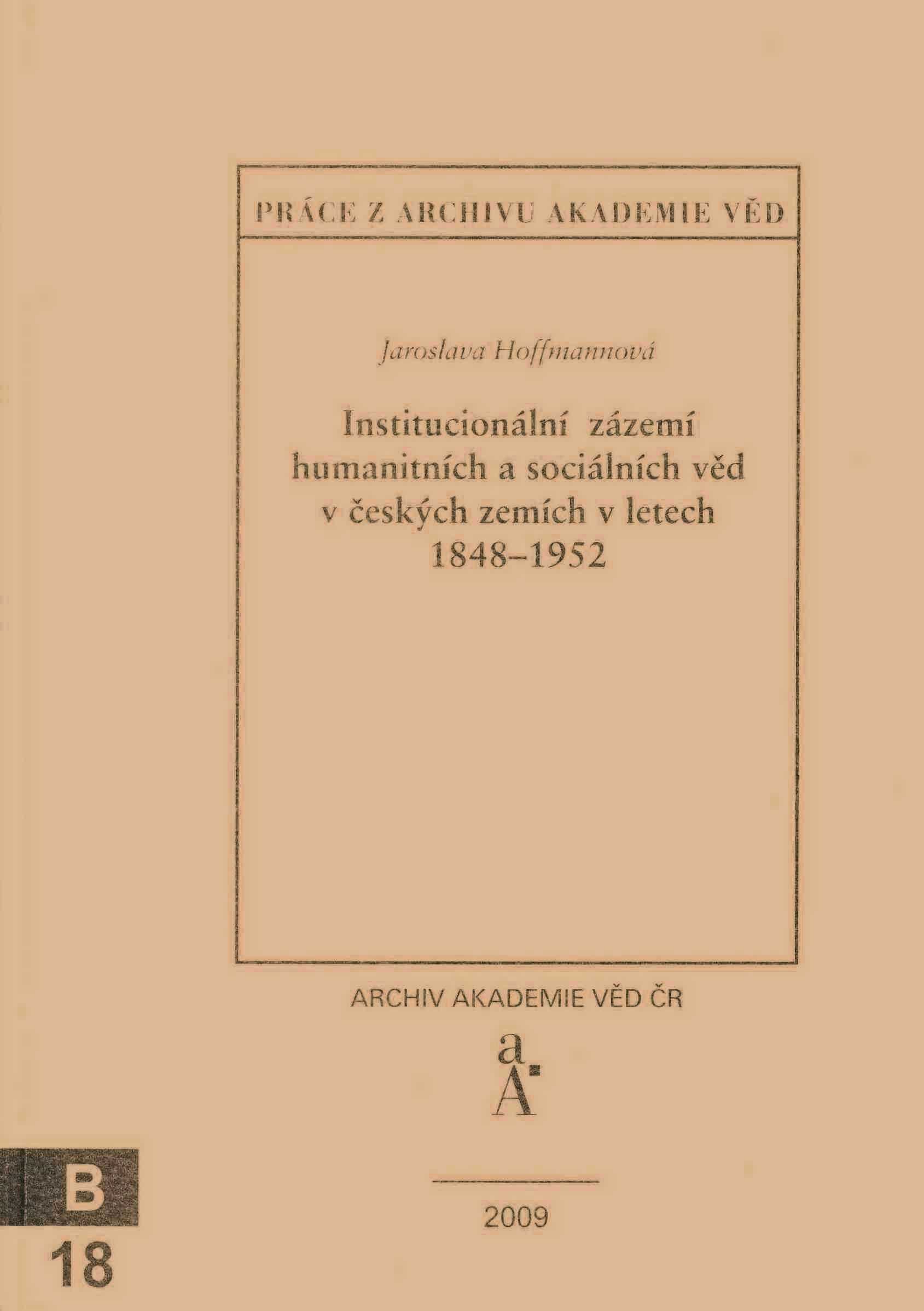 Title information Institucionální zázemí humanitních a sociálních věd v českých zemích v letech 1848-1952 / Jaroslava Hoffmannová Personal name Hoffmannová, Jaroslava, 1942- (Author) Další autoři Akademie věd České republiky. Archiv (Publisher) Publication Praha : Archiv Akademie věd ČR, 2009 Scope 367 s. ISBN 978-80-86404-25-7 (brož.) Edition Práce z Archivu Akademie věd ČRISSN1213-7928 B 18 (ř. B, sv. 18)