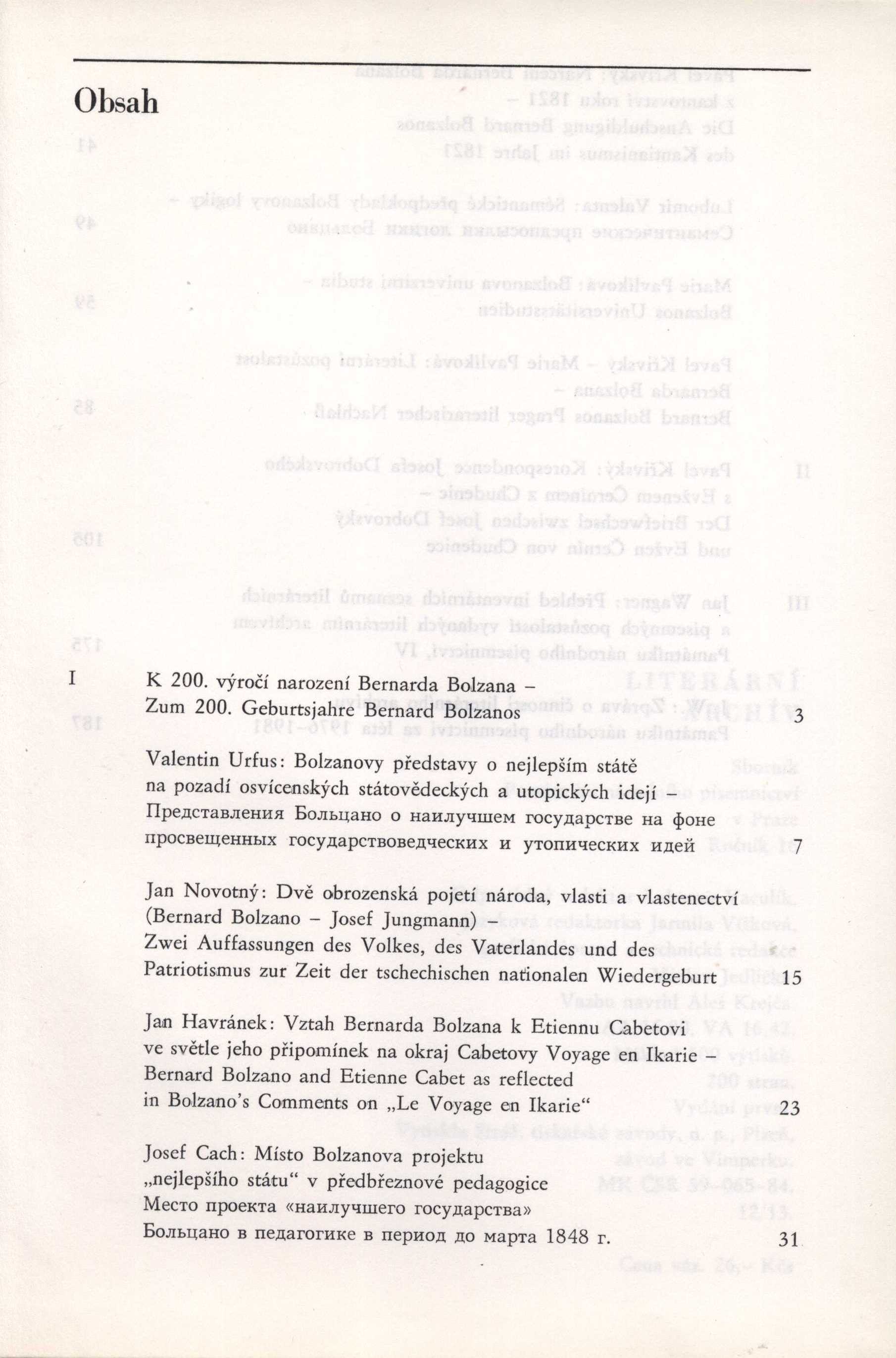 Názvové údaje Literární archív : sborník Památníku národního písemnictví = sbornik Muzeja češskoj pis'mennosti = Jahrbuch des Museums des tschechischen Schrifttums = annual of the Museum of the Czech Literature = Mémoires du Musée de la Littérature Tchèque. K 200. výročí narození Bernarda Bolzana / odpovědný redaktor Lubomír Vaculík ; grafická úprava a technická redakce Václav Jedlička Další autoři Vaculík, Lubomír, 1926-2006 (Editor) Jedlička, Václav 1931- (Knižní grafik) Korp. Památník národního písemnictví (muzeum literatury) (Nakladatel, vydavatel) Stráž, tiskařské závody (Tiskař) Roč., číslo 16, 1985 Další var.názvy K 200. výročí narození Bernarda Bolzana Údaje o vydání Vydání první Nakladatel Praha : Památník národního písemnictví, 1985 Výrobce Vimperk : Stráž, tiskařské závody, n. p., Plzeň Rozsah 195 stran ; 24 cm ISBN (Vázáno) Země vyd. Česko Jazyk dok. čeština * němčina Poznámky Text částečně německy. - Obsahuje bibliografické odkazy. - Cizojazyčná resumé. - Zpráva o činnosti literárního archivu PNP za léta 1976-1981 na str. 187-195.