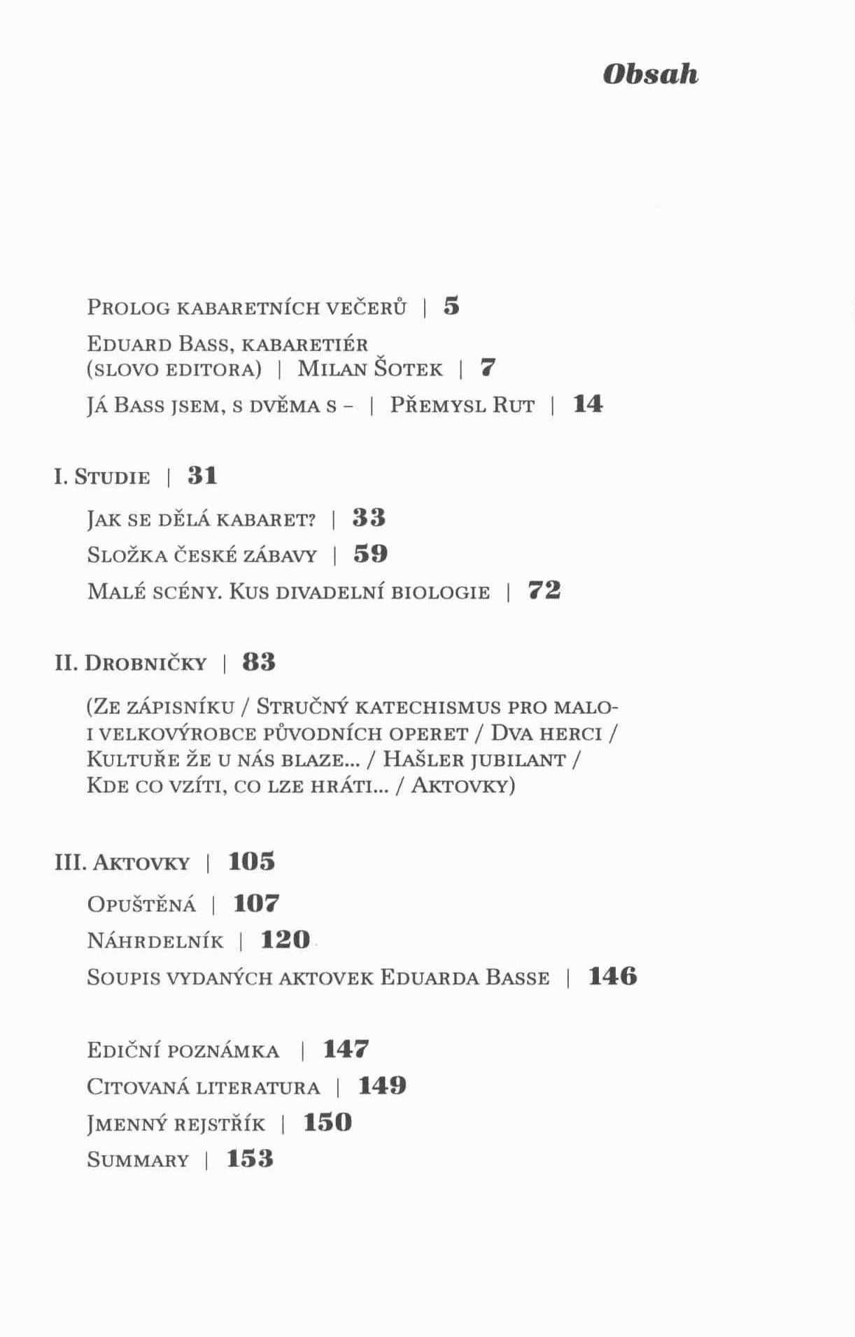 Disk, Malá řada (AMU, Kant)Country Czech Republic Language Czech Note Barevná zdobená obálka s ediční značkou. - Na přední záložce text o knize, na zadní záložce stručná biografie a bibliografie autora. - Ediční značka na vakátě. - Prolog: text písně od E. Basse. - Úvod "Eduard Bass, kabaretiér" od editora. - Bibliografické odkazy. - Soupis vydaných aktovek E. Basse. - Ediční poznámka. - Citovaná literatura. - Jmenný resjtřík. - Anglické resumé. - Text na zadní straně obálky.
