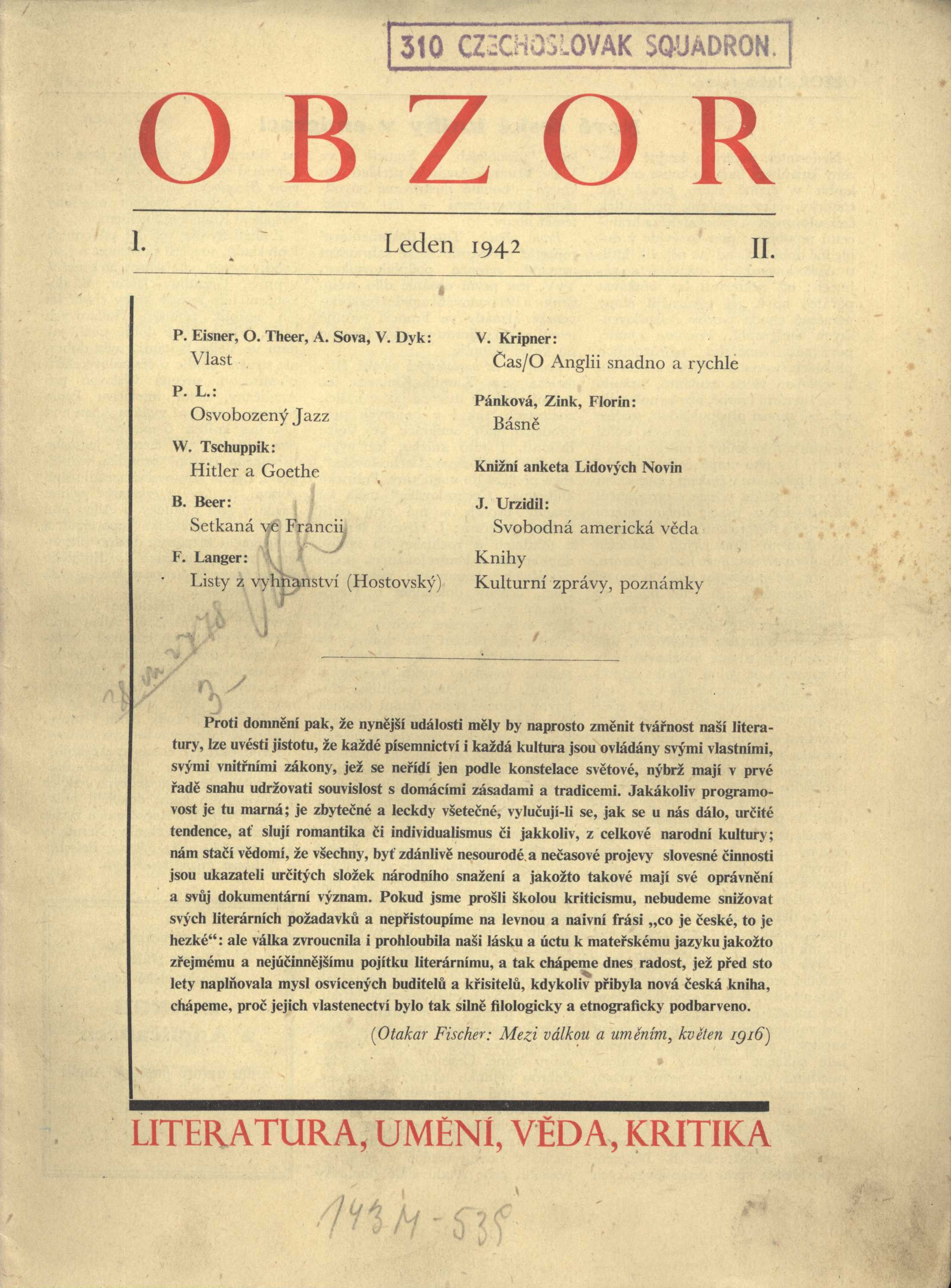 Title information Obzor : literatura, umění, věda, kritika Další autoři Beneš, Bohuš, 1901-1977 (Editor) Kripner, Viktor, 1906-1956 (Editor) Roč., číslo ročník 2, číslo 1-10, 1942 Publication Londýn : [Čechoslovák], 1942 Manufacture (Unwin Brothers Ltd.) Scope il. Country United Kingdom Language Czech Note Čb. ilustrace.