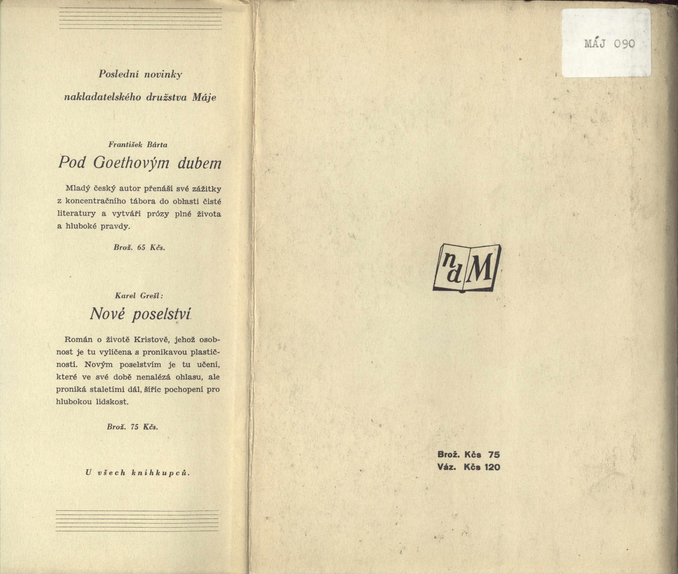 Literární klub Máj, (Nakladatelské družstvo Máje)Country Czech Republic Language Czech Note Barevná obálka. - Zdobená vazba. - Na přední záložce upoutávka na knihu. - Značka LKM. - Patitul. - Dvoubarevný titulní list. - Tiráž s edicí. - Na zadní záložce nakladatelské upoutávky. - Na zadní straně obálky značka NDM.