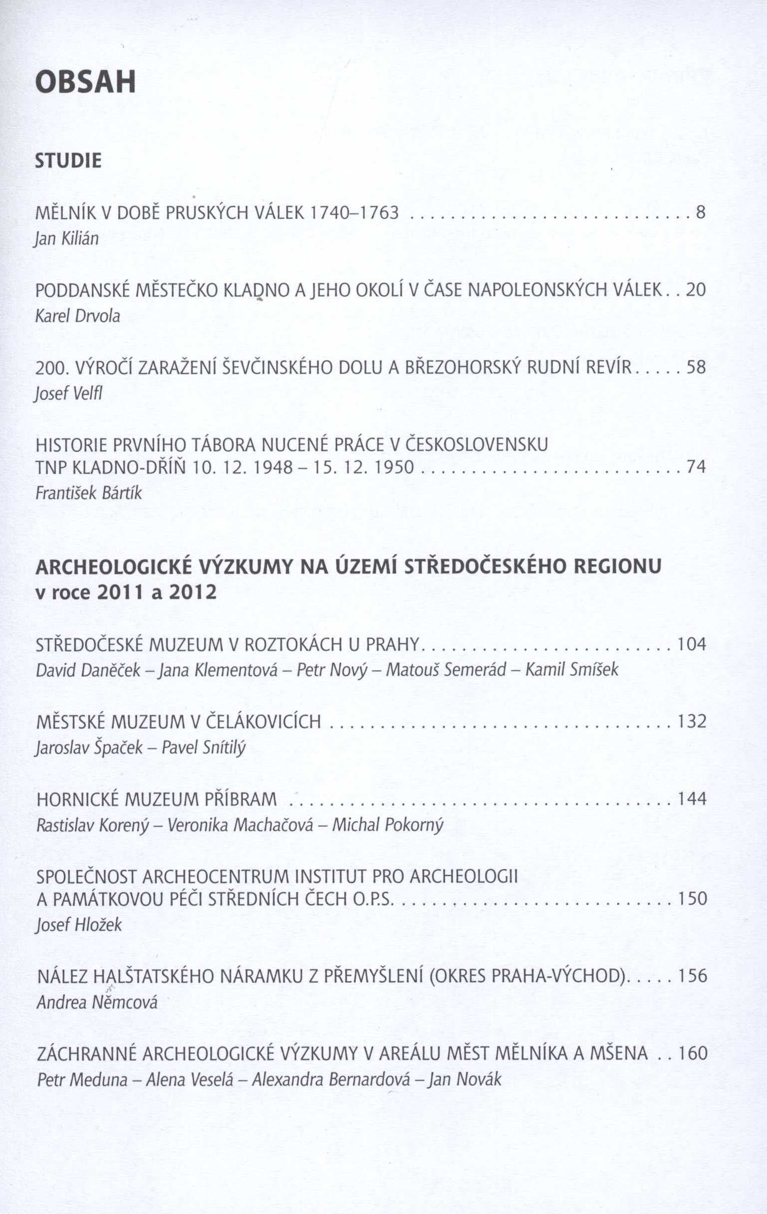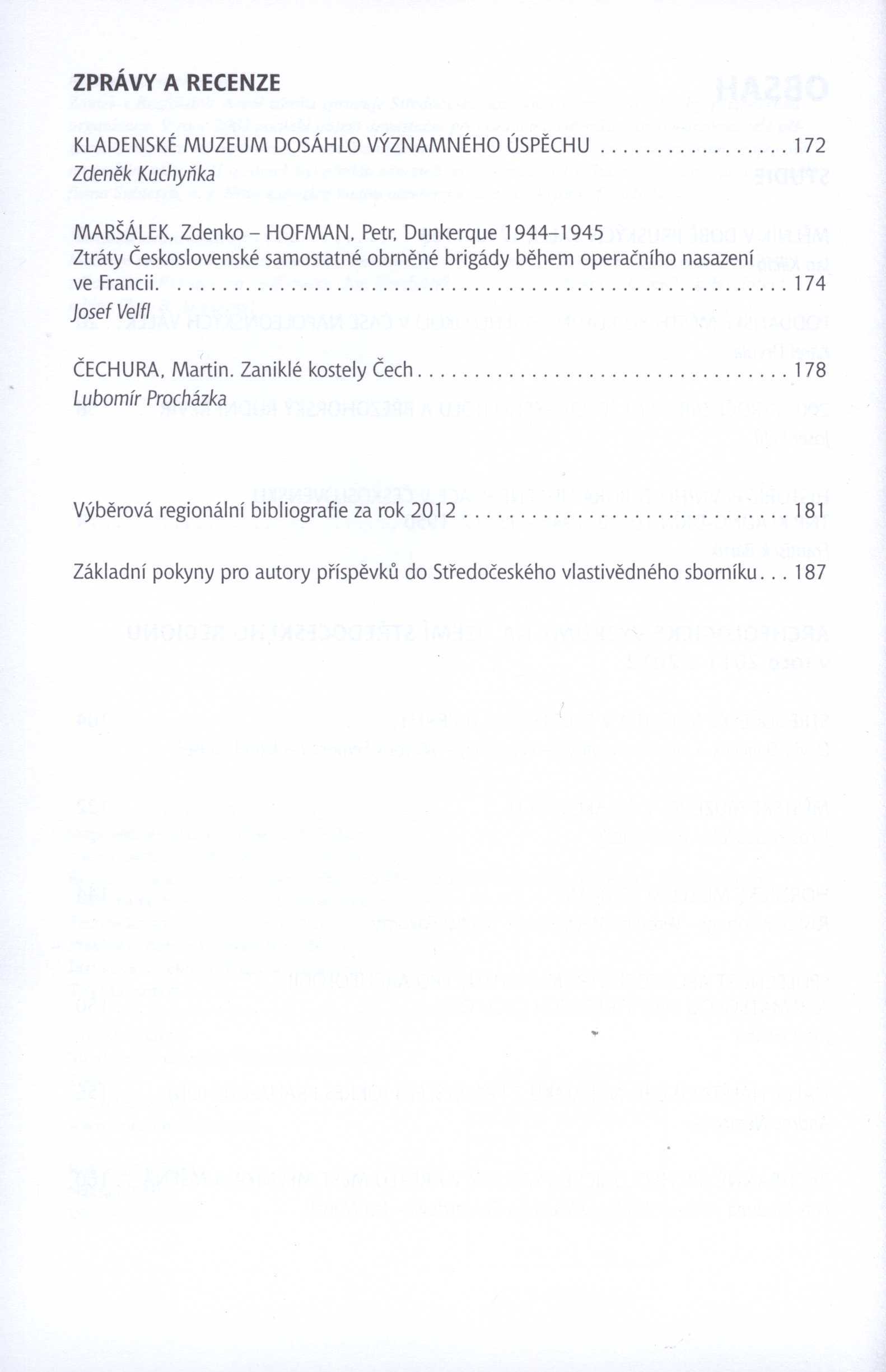 Title information Středočeský vlastivědný sborník : muzeum a současnost Další autoři Šášinková, Marcela, 1963- (Editor) Benešová, Anna (Book designer) (Compositor) Corporation Středočeské muzeum (Roztoky, Praha-západ, Česko) (pbl (Roztoky, Praha-západ, Česko)) Roč., číslo sv. 31, 2013 Publication V Roztokách u Prahy : Středočeské muzeum, 2013 Scope il., faksim. 187 s. ISSN 0862-2043 Country Czech Republic Language Czech Note Zdob. obálka. - Čb. ilustrace, fotografie a faksimile. - Obsahuje bibliografické odkazy. - Německá resumé. - Výběrová regionální bibliografie za rok 2012 na str. 181-185. - 200 výtisků.