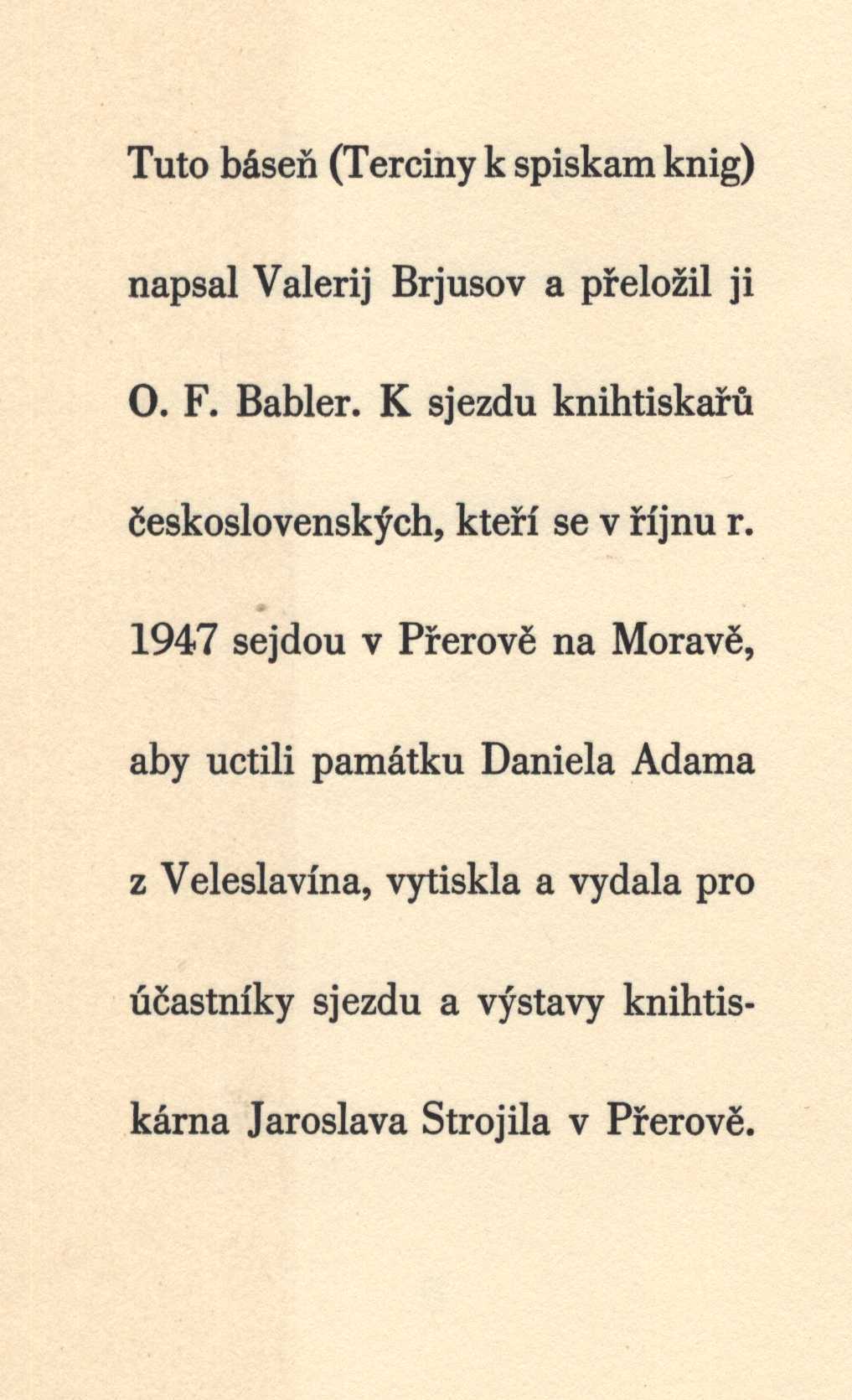Title information Tercíny na katalogy knih / Valerij Brjusov ; [přeložil O.F. Babler] Personal name Brjusov, Valerij Jakovlevič, 1873-1924 (Author) Další autoři Babler, Otto František, 1901-1984 (Translator) Corporation Knihtiskárna J. Strojil (Publisher) Publication V Přerově : Vytiskla a vydala knihtiskárna Jaroslava Strojila, 1947 Scope 8 s. ISBN bez vazby Country Czech Republic Language Czech Language of the original Russian Note Vydáno k sjezdu knihtiskařů československých, kteří se sejdou v říjnu r. 1947 v Přerově na Moravě, aby uctili památku Daniela Adama z Veleslavína