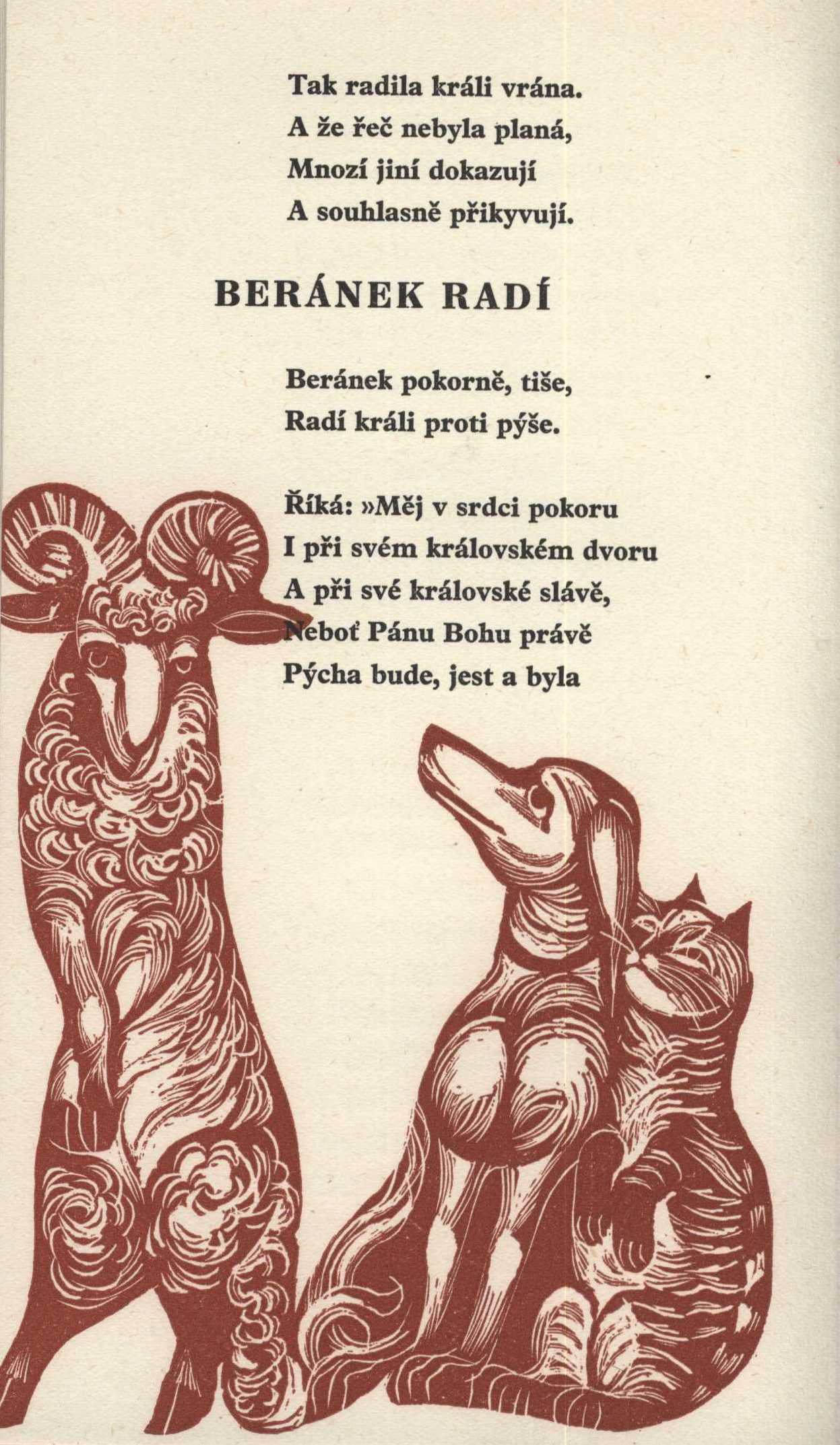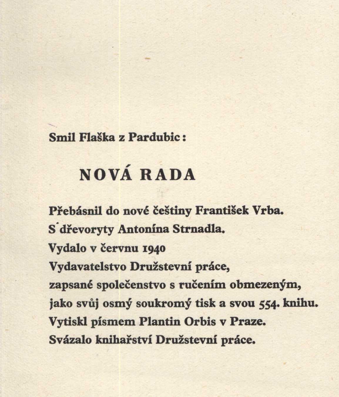 Title information Nová rada / Smil Flaška z Pardubic ; [přebásnil do nové češtiny František Vrba ; s dřevoryty Antonína Strnadla] Personal name Flaška z Pardubic a Rychmburku, Smil, asi 1349-1403 (Author) Další autoři Strnadel, Antonín, 1910-1975 (Illustrator) Vrba, František, 1920-1985 (Adapter) Corporation Družstevní práce (nakladatelství) (Publisher) knihařství Družstevní práce (Praha) (Binder) Orbis (tiskárna) (Printer) Publication [S. l.] : Družstevní práce, 1940 Manufacture (Orbis) Scope 104 s. : il. ISBN (váz.) Country Czech Republic Language Czech Note Ilustrovaný titulní dvojlist, tištěný modře a černě. - Hnědě tištěné dřevoryty A. Strandela - celostránkové i v textu. - Doslov napsal Karel Polák. - Osmý soukromý tisk Družstevní práce. - Zdobená poloplátěná vazba. - Zdobený přebal, resp. obálka. - Sazba písmem Plantin.