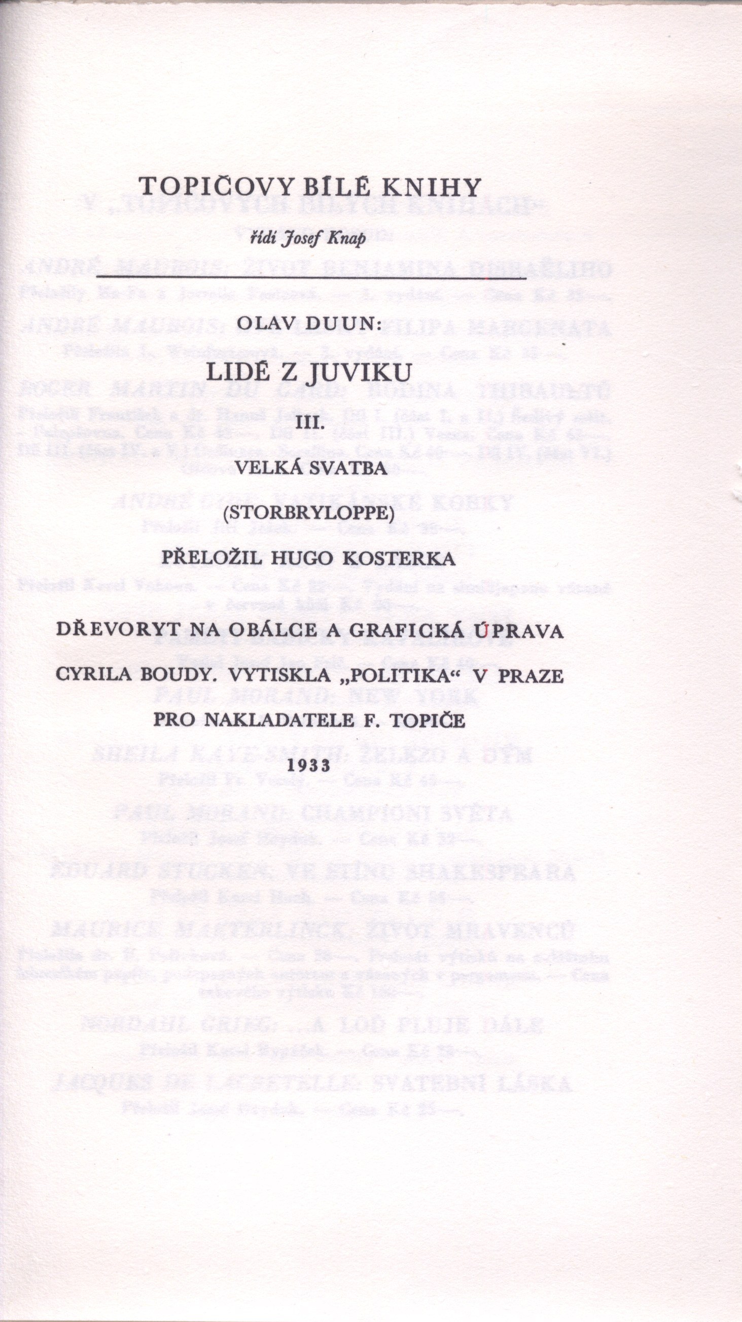 Title information Lidé z Juviku / Olav Duun ; přeložil Hugo Kosterka ; [dřevoryt na obálce a grafická úprava Cyrila Boudy]. III, Velká svatba Personal name Duun, Olav, 1876-1939 (Author) Další autoři Kosterka, Hugo, 1867-1956 (Translator) Bouda, Cyril, 1901-1984 (Illustrator) (Book designer) Corporation F. Topič (nakladatelství) (Publisher) Politika (tiskárna, nakladatelství) (Printer) Publication V Praze : Nakladatel F. Topič, 1933 Manufacture (Politika) Scope 178 s. ; 23 cm ISBN brož. Edition Topičovy Bílé knihy / řídí Josef Knap