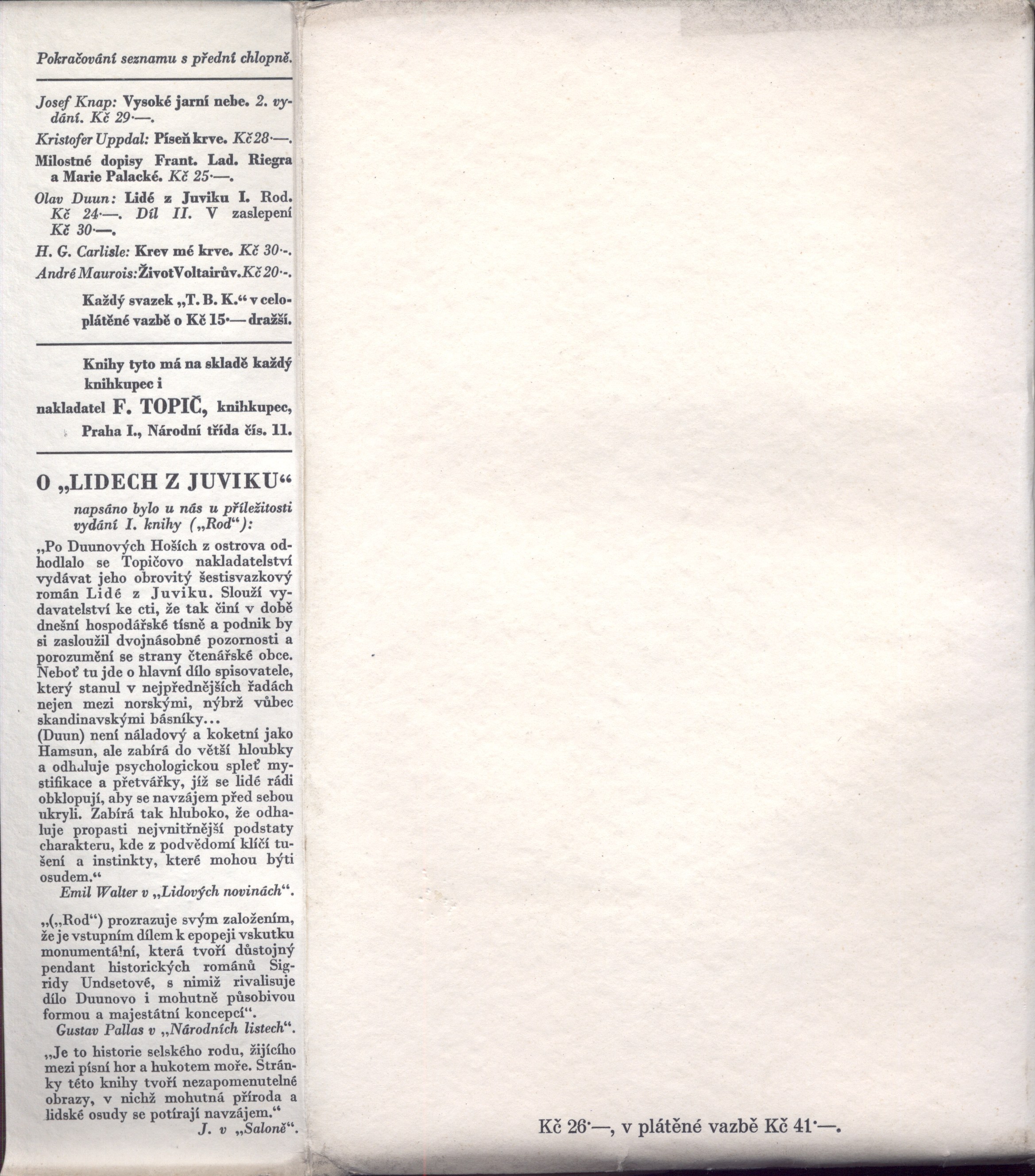 Topičovy Bílé knihy, (F. Topič)Country Czech Republic Language Czech Language of the original Norwegian Note Obálka s ilustrací. - Upoutávky na záložkách. - Dvoubarevný titulní list. - Edice nad tiráží. - Ediční upoutávky.