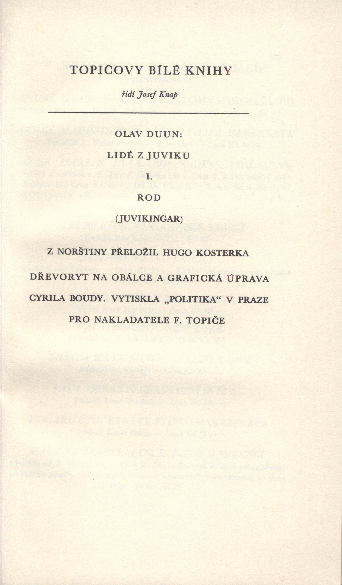 1. Title informationLidé z Juviku / Olav Duun ; [z norštiny přeložil] přeložil Hugo Kosterka ; [dřevoryt na obálce a grafická úprava Cyrila Boudy]. I, Rod