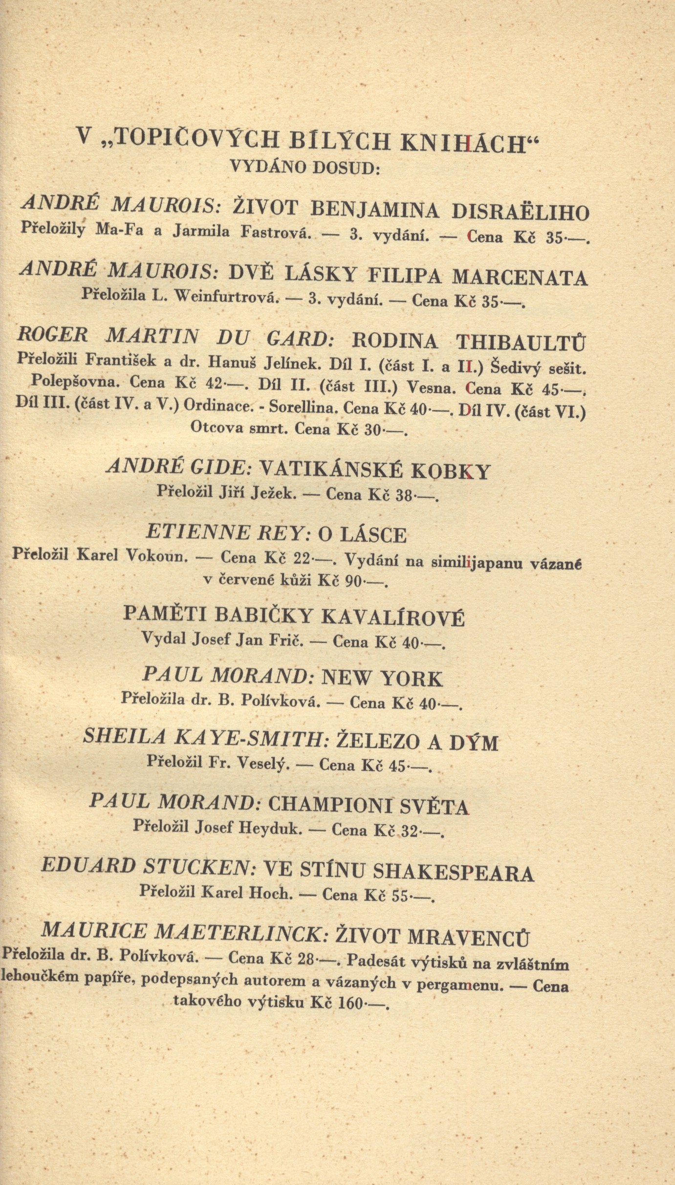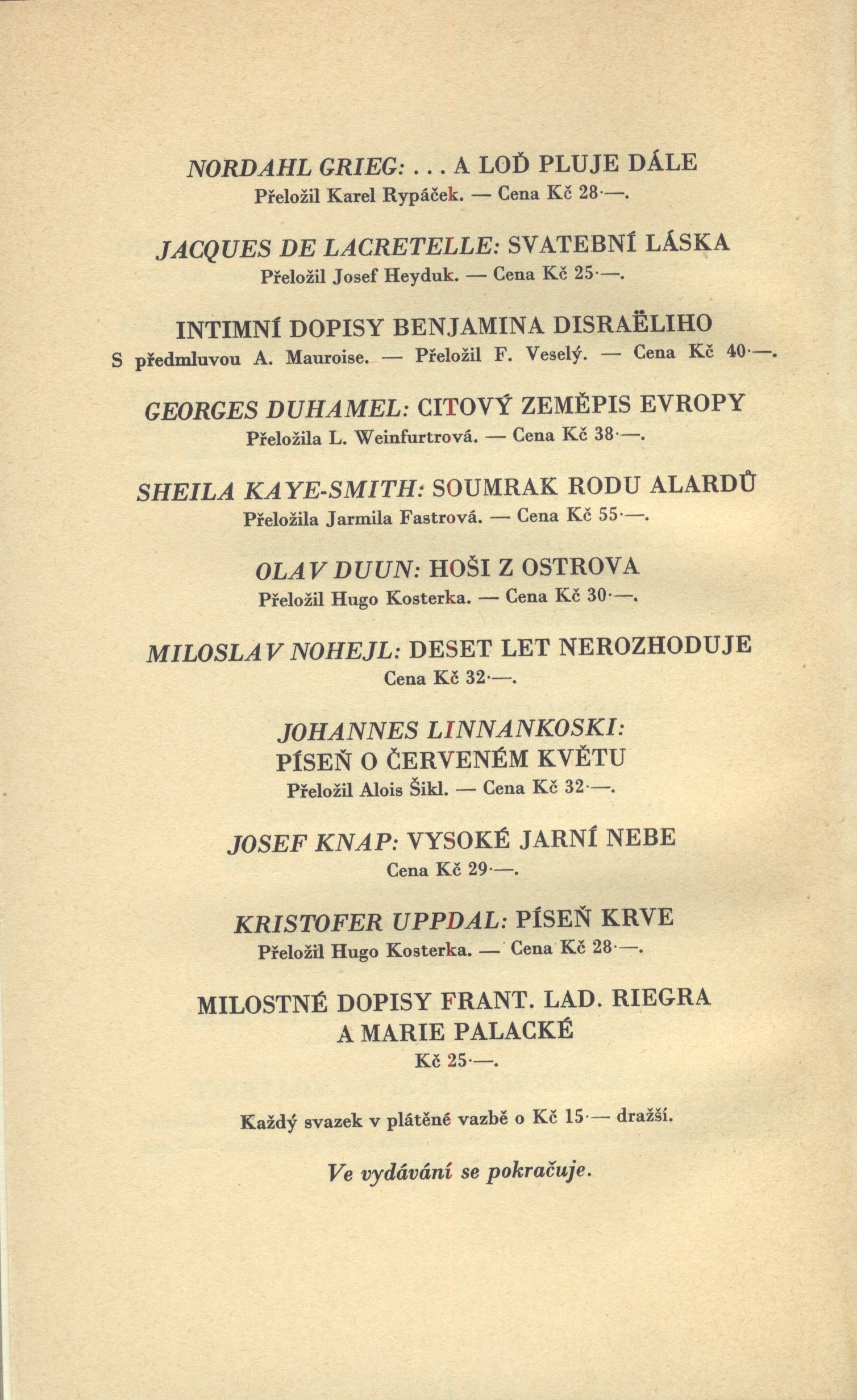U sign. Topič 0114 (vázaný výtisk) obálka s ilustrací (C. Bouda). - Upoutávky na záložkách. - Světle béžová celoplátěná vazba se zlacenou ražbou textu i na hřbetu. - Vakát. - Patitul. - Dvoubarevný titulní list s nakladatelskou značkou (C. Bouda - neuvedeno). - Edice nad tiráží. - Ediční upoutávky. - Vakát. - Na zadní straně obálky uvedeny ceny. - Vloženo do ochranného kartonového pouzdra.