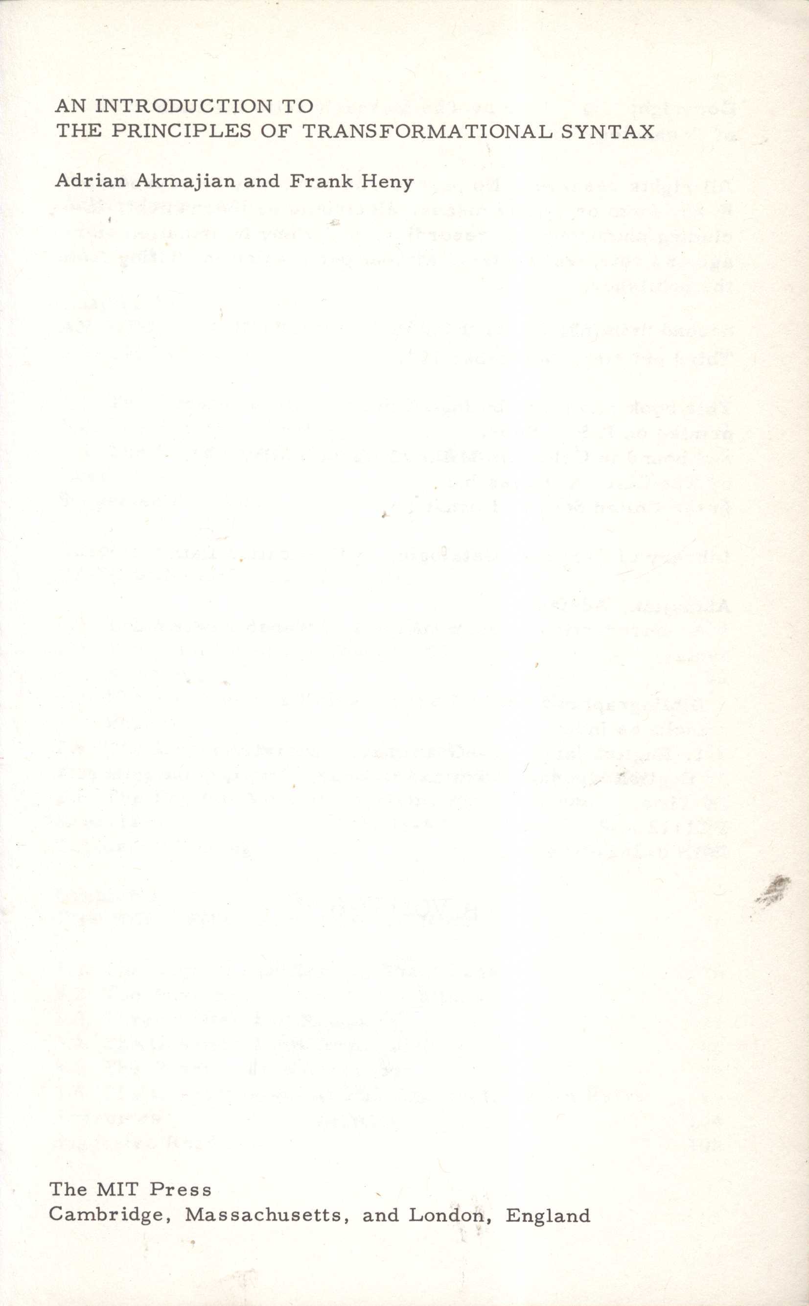 1. Title informationAn introduction to the principles of transformational syntax : Adrian Akmajian and Frank Heny