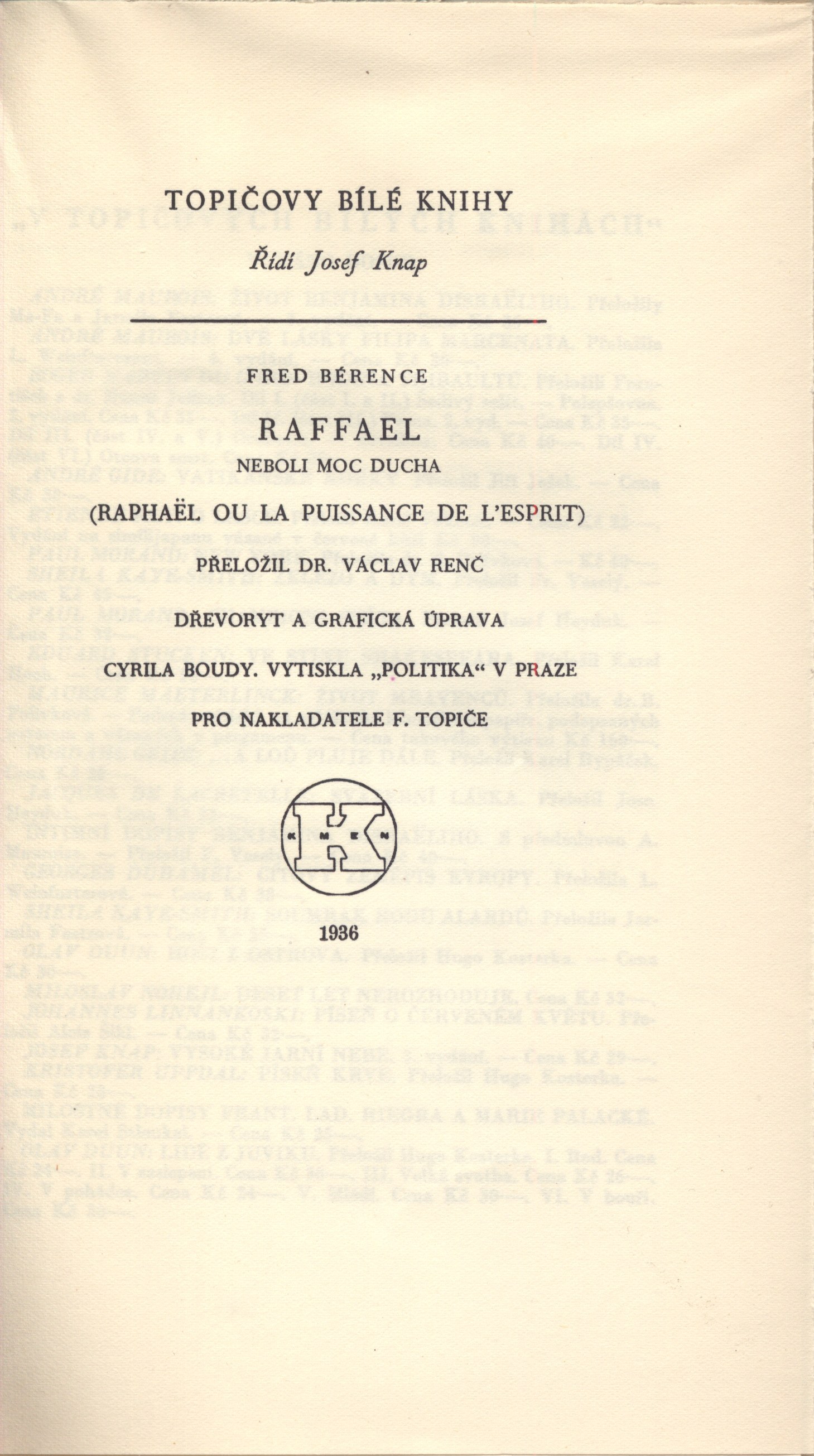Title information Raffael neboli moc ducha / Fred Bérence ; přeložil Václav Renč ; [dřevoryt a grafická úprava Cyrila Boudy] Personal name Bérence, Fred, 1889-1977 Další autoři Renč, Václav, 1911-1973 (Translator) Bouda, Cyril, 1901-1984 (Illustrator) (Book designer) Corporation F. Topič (nakladatelství) (Publisher) Politika (tiskárna, nakladatelství) (Printer) Další var.názvy Raffael Publication V Praze : Nakladatel F. Topič, 1936 Manufacture (Politika) Scope 309 s., [1] l. obr. příl. : il. ; 23 cm ISBN brož. Edition Topičovy Bílé knihy / řídí Josef Knap