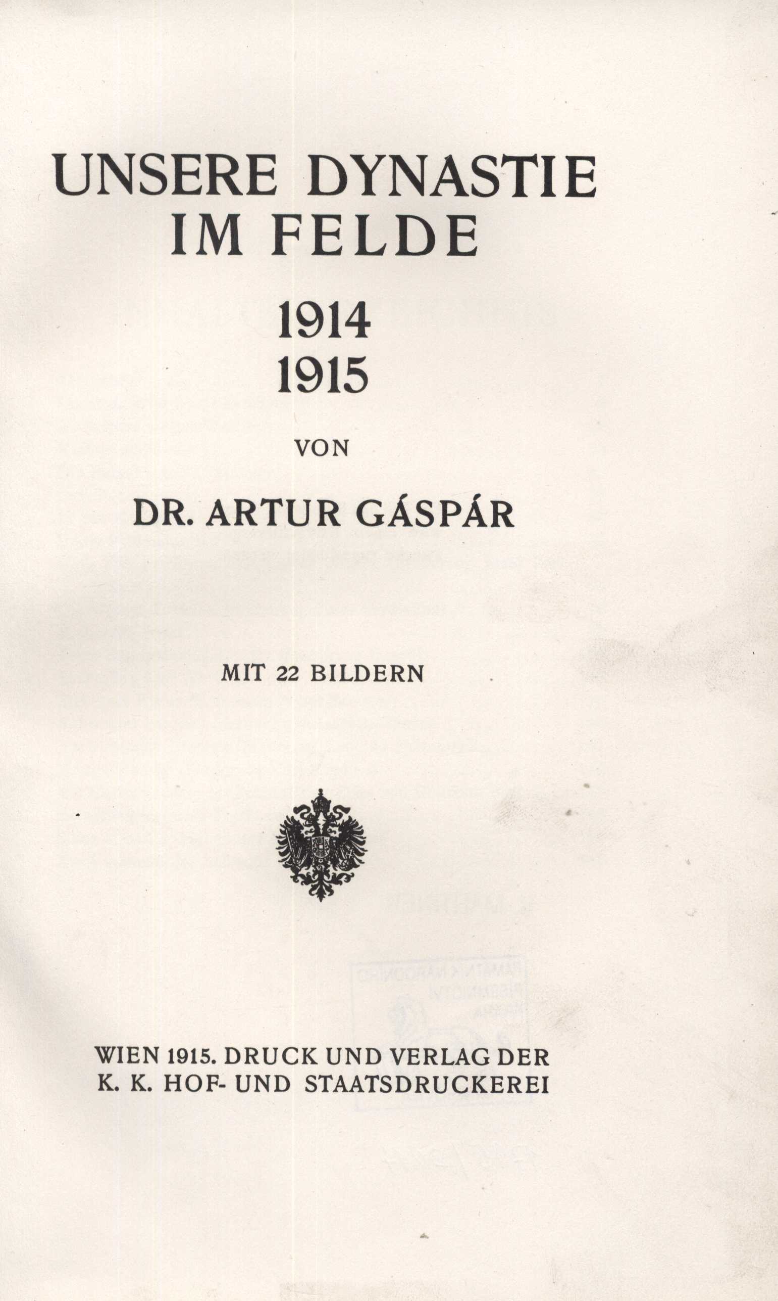 Title information Unsere Dynastie im Felde 1914-1915 / von Artur Gáspár Personal name Gáspár, Artur (Author) Publication Wien : Druck und Verlag der K.K. Hof- und Staatdsdruckerei, 1915 Scope 163 s., [22] obr. příl. ISBN (váz.) Country Czech Republic Language German Note Zlacený tisk na vazbě. - Na frontispisu podobizna císaře Franze Josepha I. - Nestránkované černobílé fotografie.