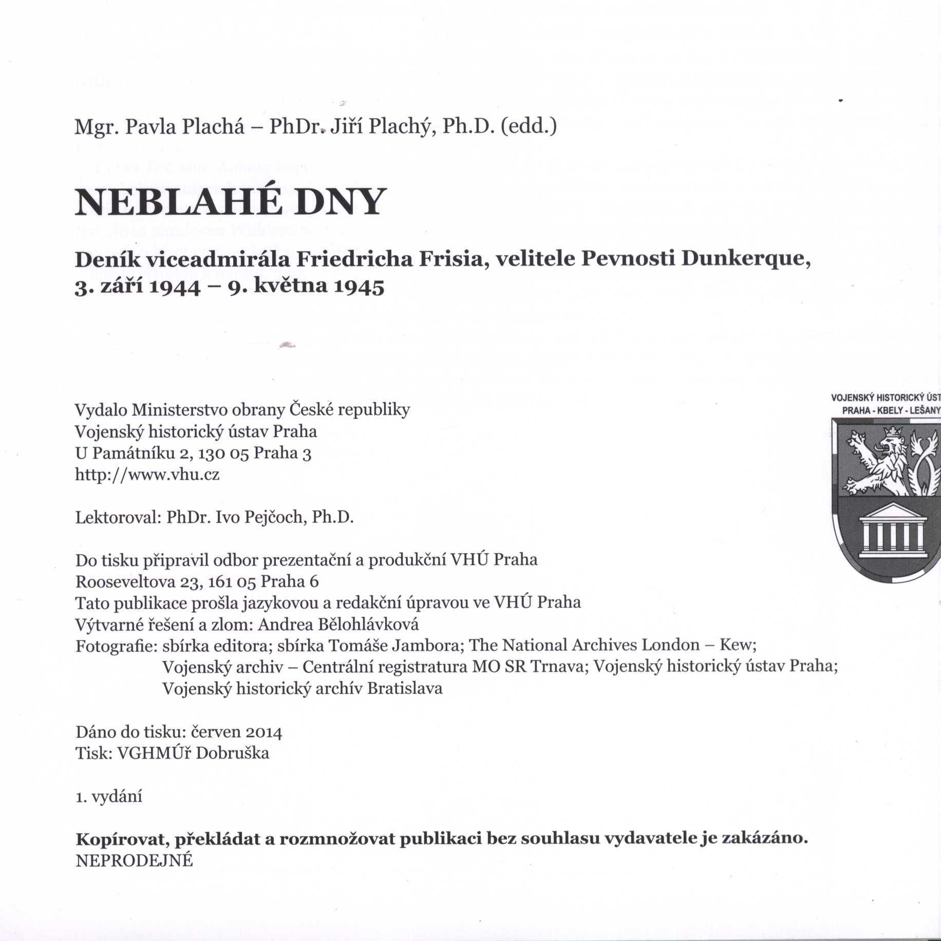 Title information Neblahé dny : deník viceadmirála Friedricha Frisia, velitele Pevnosti Dunkuerque : 3. září 1944 - 9. května 1945 / Pavla Plachá, Jiří Plachý (edd.) Personal name Frisius, Friedrich, 1895-1970 (Author) Další autoři Plachá, Pavla, 1976- (Editor) Plachý, Jiří, 1975- (Editor) Bělohlávková, Andrea (Book designer) Corporation Vojenský historický ústav (Praha) (Publisher) Vojenský geografický a hydrometeorologický úřad (Printer) Další var.názvy Deník viceadmirála Friedricha Frisia, velitele Pevnosti Dunkuerque Edition statement 1. vyd. Publication Praha : Vojenský historický ústav, 2014 Manufacture VGHMÚř) Scope 126 s. : il., portréty, faksim. + 1 příl. ISBN 978-80-7278-635-0 (brož.) Country Czech Republic Language Czech Language of the original French * German Note Přeloženo z francouzské verze německého originálu. - Fotografie na obálce a titulním listu. - Černobílé fotografie, portréty, kresby, mapky a faksimile v textu. - Poznámky pod čarou. - Obsahuje bibliografii. - České a německé resumé. - Vložena příloha: přetisk dobové mapy.