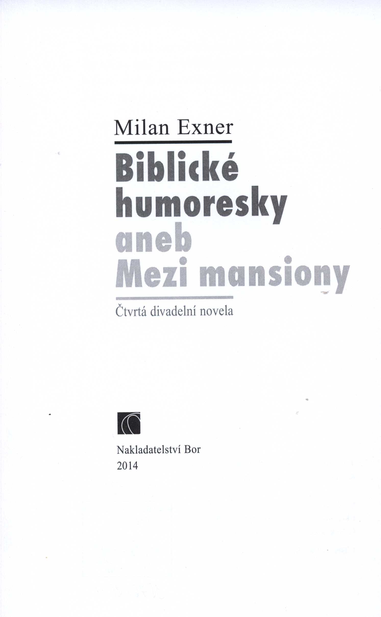 Title information Biblické humoresky, aneb, Mezi mansiony : čtvrtá divadelní novela / Milan Exner ; [ilustrace a grafická úprava Roman Karpaš] Personal name Exner, Milan, 1950- (Author) Další autoři Karpaš, Roman, 1951- (Illustrator) Corporation Nakladatelství Bor (Publisher) Marten (tiskárna) (Printer) Další var.názvy Mezi mansiony Biblické humoresky, neboli, Mezi mansiony Edition statement Vyd. 1. Publication Liberec : Nakladatelství Bor, 2014 Manufacture Marten) Scope 327 s. : il. ISBN 978-80-87607-32-9 (brož.) Country Czech Republic Language Czech Note Ilustrace na obálce. - Na záložkách obálky anotace a bio-bibliografická poznámka o autorovi s fotem. - Frontispis. - Černobílé celostránkové ilustrace.