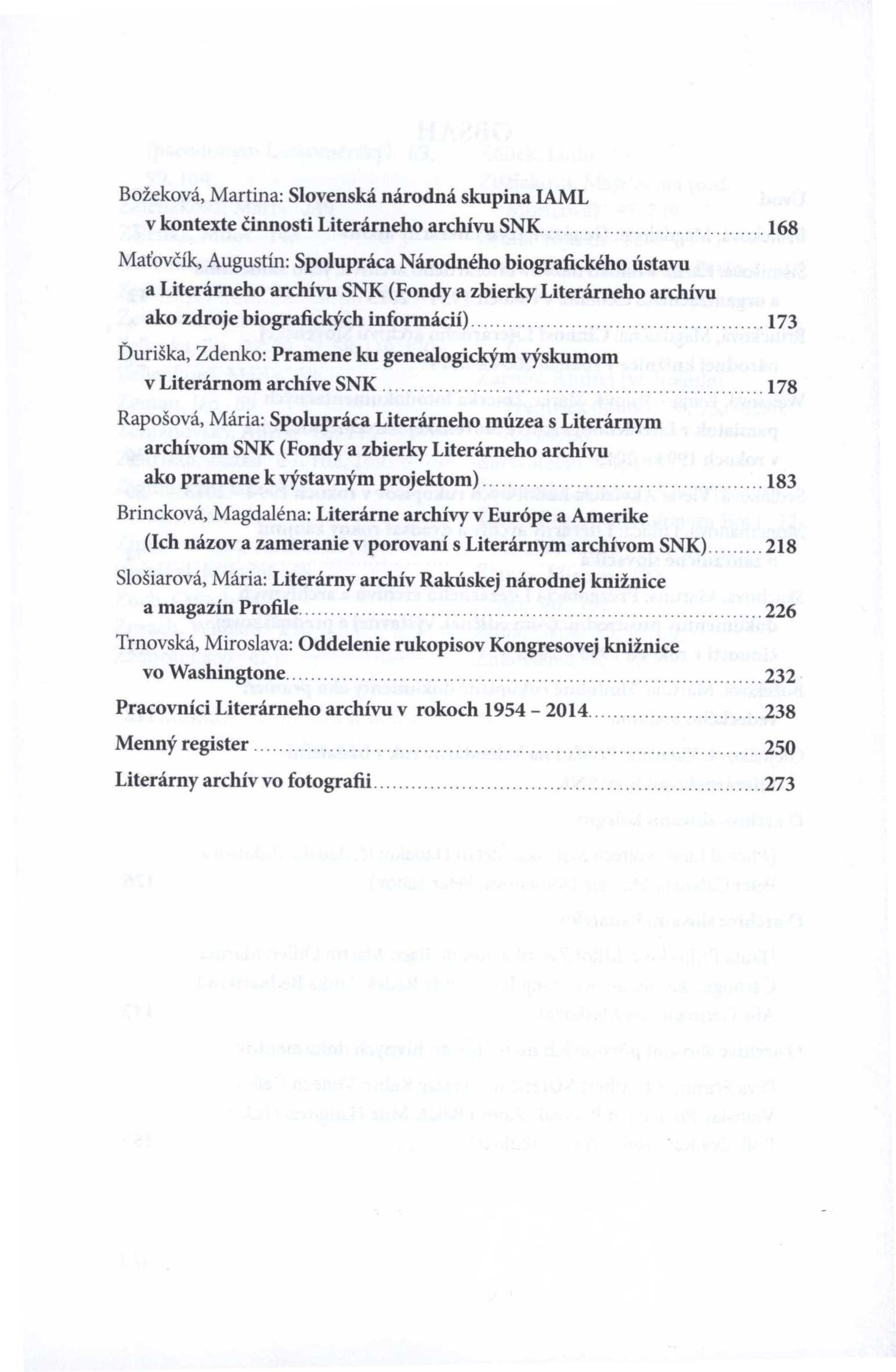 Note Čb. i barevné fotografie a portréty. - Obsahuje bibliografii a bibliografické odkazy. - Seznam pracovníků Literárního archivu v letech 1954-2014. - Jmenný rejstřík.
