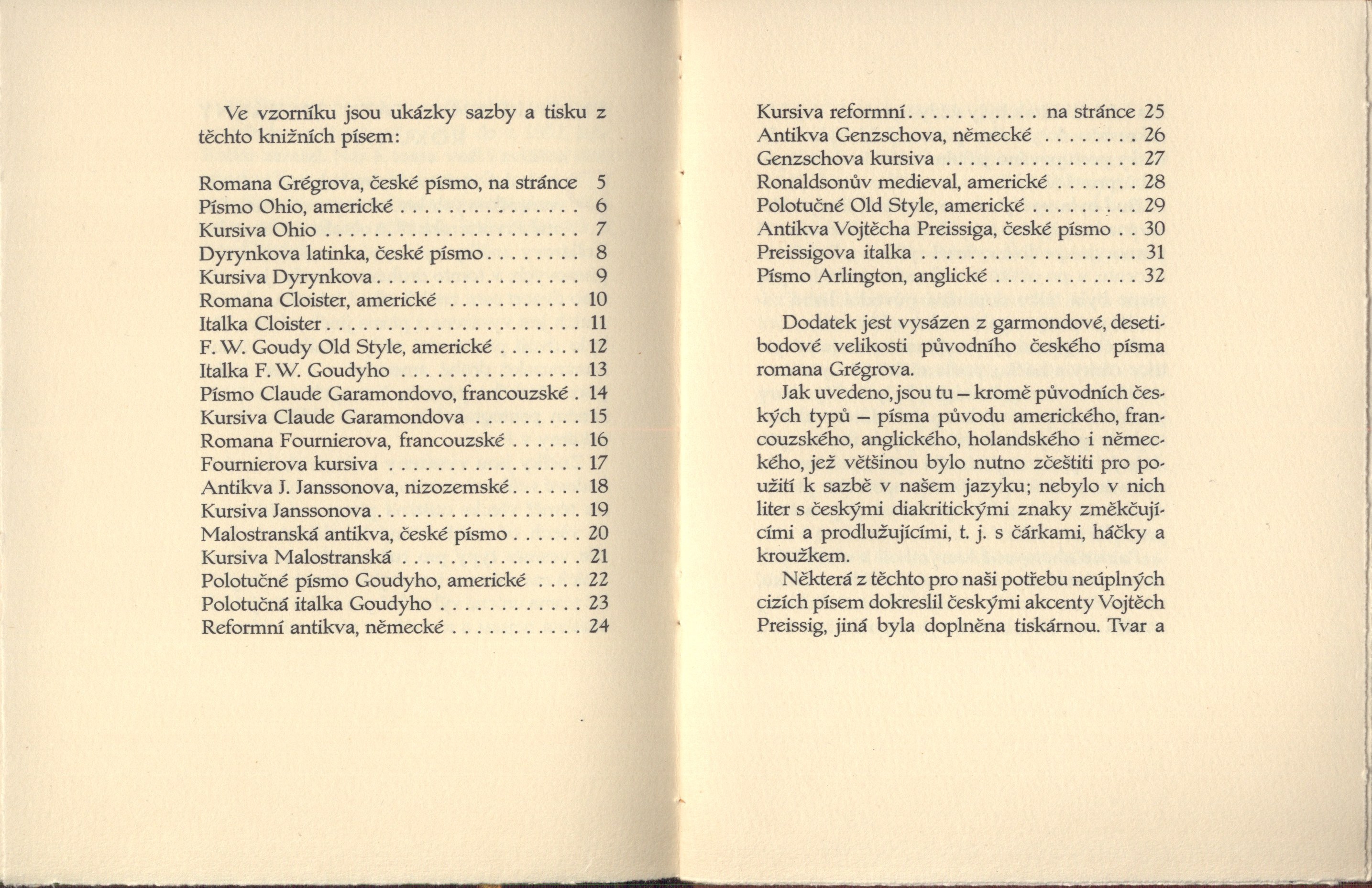 Document kind monografie Obálkový název Dvacet osm znělek Keywords Státní tiskárna * ukázky textů * druhy písma * ruční sazba * Kollár J. * znělky * bibliofilský výtisk * číslovaný výtisk UDC 821.162.3 * 82-1 * 655.26 * (0.027.6) * 090.1 Uživatelské pole PNP U sign. Topič osobní knihovna Topiče a Milady Blekastad. U sign. Topič 0528 (vázaný výtisk) hnědý papírový potah na kartonu i na pouzdru, nalepený štítek na hřbetu vazby. - Značka Státní tiskárny (V. Preissig - neuvedeno). - Dvoubarevný titulní list. - Text znělek s paginací, vytištěno 28 typy písma ruční sazbou. - Dodatek: "O prvních vydáních Kollárovy »Slávy dcery«" a "Knižní písma Státní tiskárny roku 1931" (K. Dyrynk) s červenými iniciálami. - Tiráž s číslem výtisku. - Ukázky českých písem. - Tištěno na japanu. - Ochranné kartonové pouzdro. U sign. Topič 0528 číslo výtisku ručně (černě, perem): "VIII". - Zachovalý výtisk se žlutooranžovou lacetkou a prošitím téže barvy. Výtisky tištěny na chamois van Gelderu, značené římsky na pravém japanu - neuvedeno. Rozsah: 32, [20] s. Rozměr knihy: 16,2 cm; rozměr pouzdra: 16,7 cm Sáňka 3667 Signatura Přír.číslo Lokace Info Topič 0528 0161/2015 Sbírka