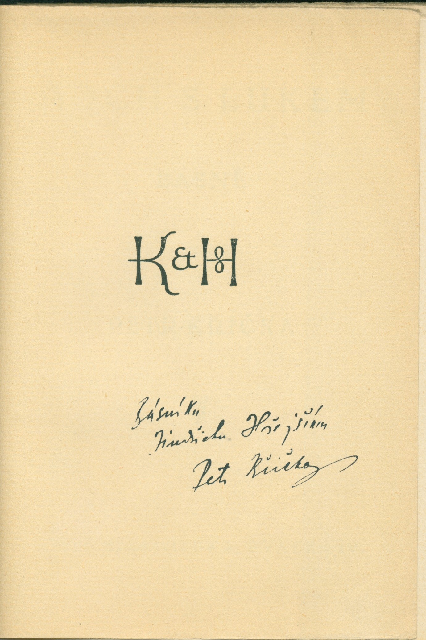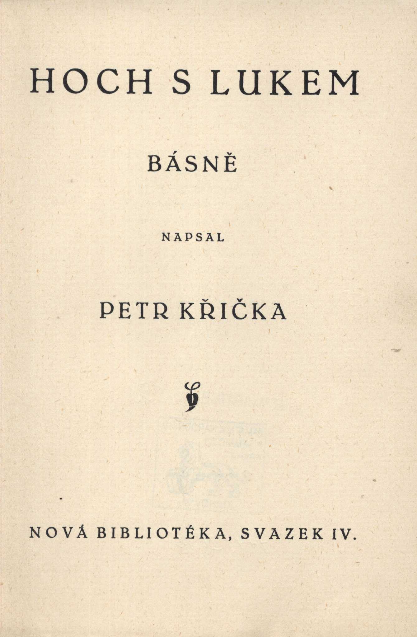 Title information Hoch s lukem : básně / napsal Petr Křička Personal name Křička, Petr, 1884-1949 (Author) (Dedicator) (Inscriber) Další autoři Brunner, Vratislav Hugo, 1886-1928 (Book designer) (Illustrator) (Bookjacket designer) Hořejší, Jindřich, 1886-1941 (Dedicatee) Corporation Kvasnička a Hampl (nakladatelství) (Publisher) Politika (tiskárna, nakladatelství) (Printer) Další var.názvy Básně Edition statement Druhé vydání Publication Král. Vinohrady [Praha] : Nakladatelé Kvasnička a Hampl, 1925 Manufacture V Praze : Tisk Politiky Scope 79 stran ; 18 cm ISBN (Brožováno) Edition Nová bibliotéka svazek IV.