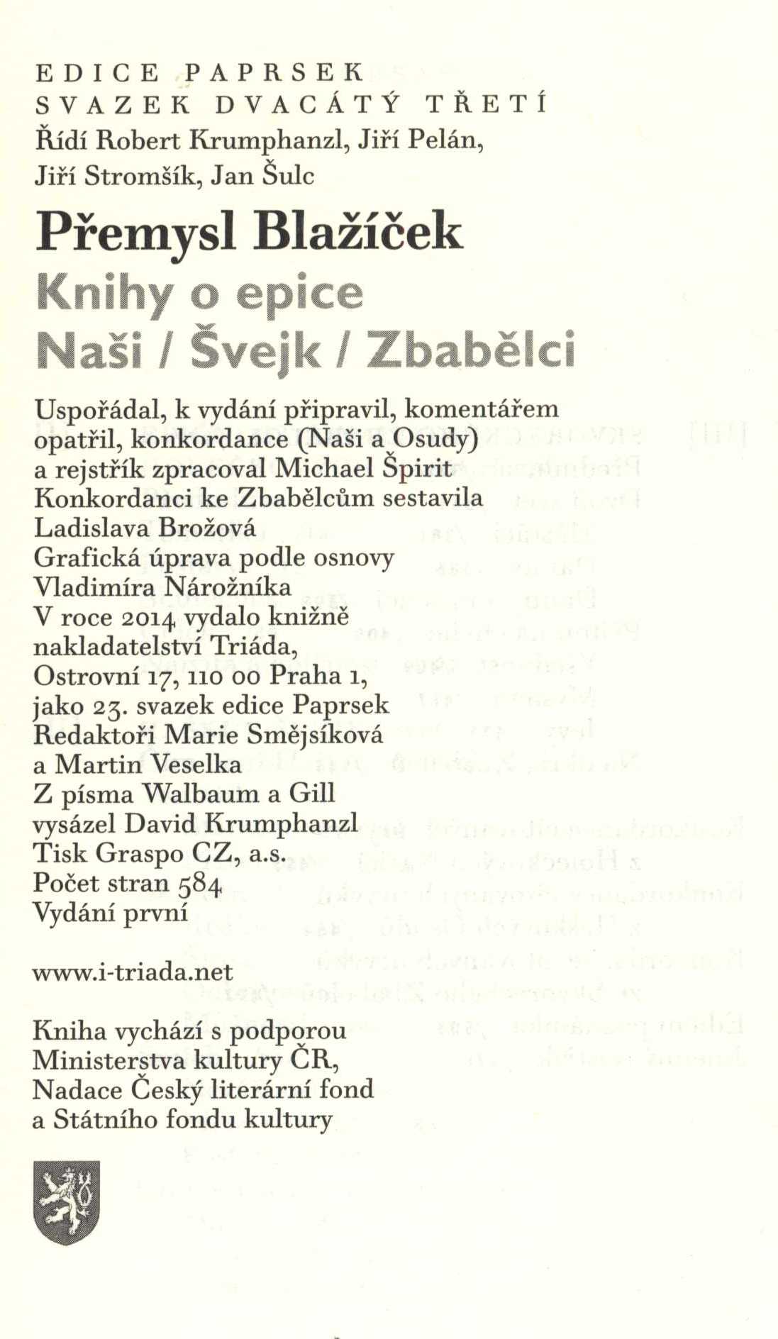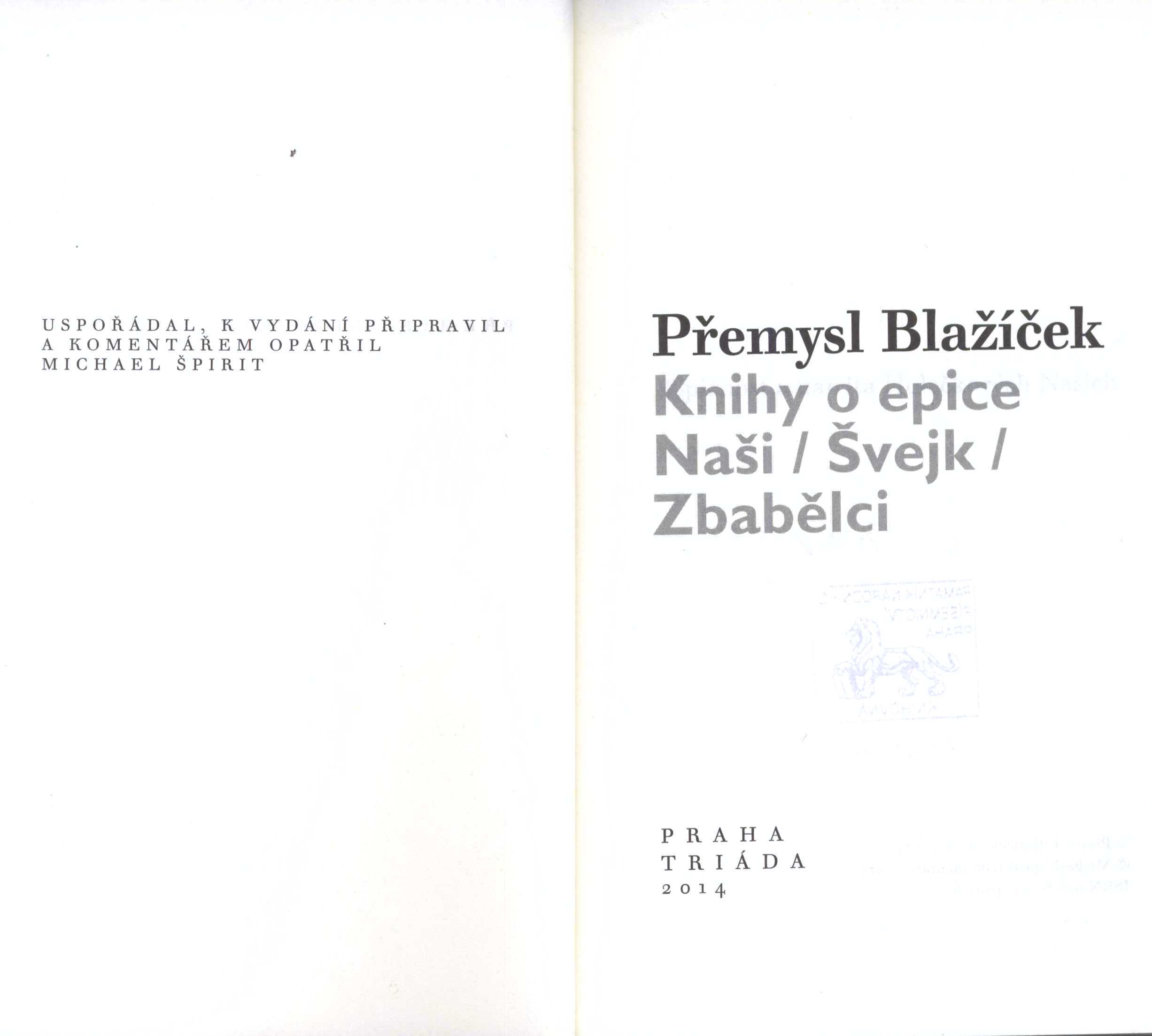 Title information Knihy o epice : Naši, Švejk, Zbabělci / Přemysl Blažíček ; uspořádal, k vydání připravil a komentářem opatřil Michael Špirit ; [grafická úprava podle osnovy Vladimíra Nárožníka] Personal name Blažíček, Přemysl, 1932-2002 (Author) Další autoři Špirit, Michael, 1965- (Commentator for written text) (Editor) Nárožník, Vladimír, 1939-2002 (Book designer) Corporation Triáda (nakladatelství) (Publisher) Graspo (tiskárna) (Printer) Edition statement Vyd. 1. Publication Praha : Triáda, 2014 Scope 583 s. ; 19 cm ISBN 978-80-7474-103-6 (brož.) Edition Paprsek sv. 23