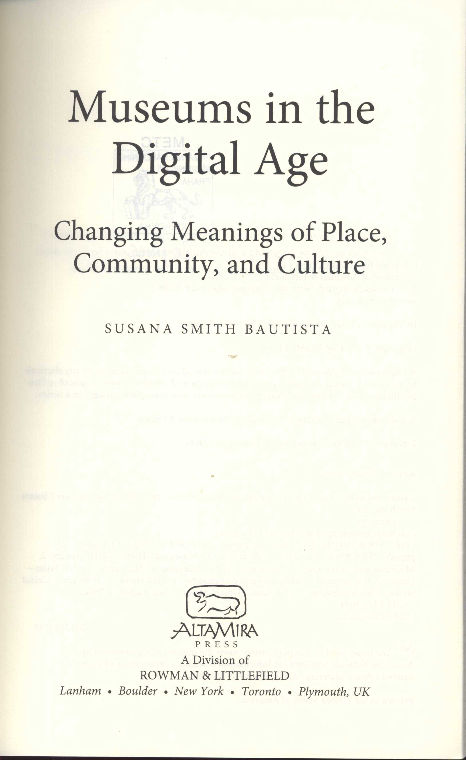 Title information Museums in the digital age : changing meanings of place, community, and culture / Susana Smith Bautista Personal name Bautista, Susana Smith, 1966- (Author) Publication Lanham : Altamira Press, 2014 Scope xxvi, 279 s. : il. ISBN 978-0-7591-2413-4 (brož.) Country United States Language English Note Zdobená obálka. - Černobílé fotografie. - Nakladatelská značka. - Vakáty. - Bibliografie. - Rejstřík. - Na zadní straně obálky informace o knize a autorce.