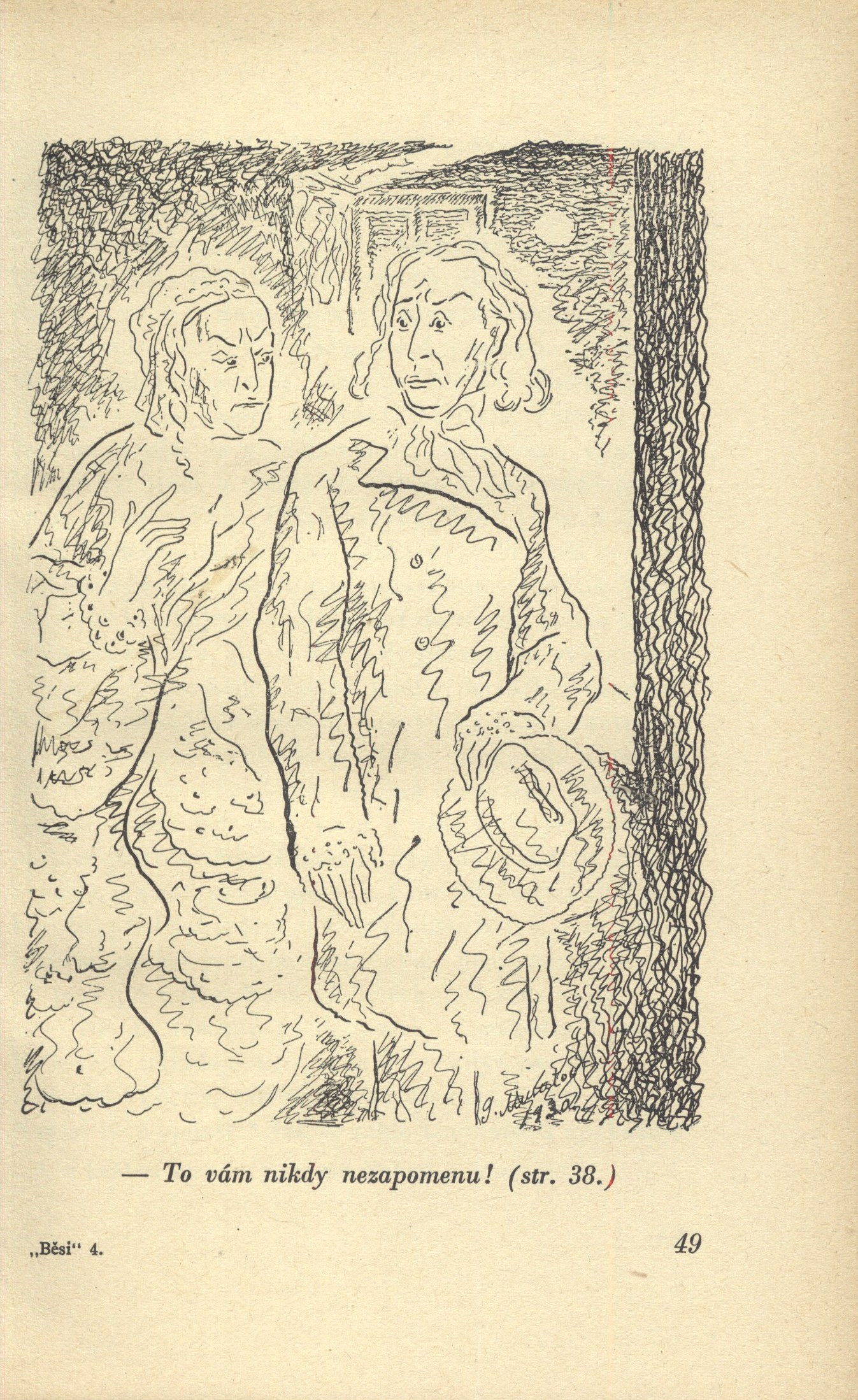 Document kind monografie Obálkový název Běsi I. Translation of Běsy Keywords ruská literatura * próza * překlad * román * Dostojevskij F. M. UDC 821.161.1 * 82-3 * =030 * 82-31 Uživatelské pole PNP U sign. P 100 d 29 červená typizovaná celoplátěná vazba s černou ražbou značky (MK) a textem na hřbetu. - Barevně zdobené předsádkové listy. - Nakladatelská značka (nikoli signet). - Edice. - Jako frontispis ilustrace (portrét F. M. Dostojevského). - Titulní list. - Na rubu titulního listu překladatel. - Předmluva: "Okolo Běsů" (B. Mathesius). - Celostránkové ilustrace (G. Musatov). - Poznámky dole na stránce. - Obsah. - Bez tiráže. U sign. P 100 d 29 vazba mírně zašpiněná, v textu tužkou podtrhávky. Melantrichova knižnice, svazek neuveden; ilustrátor a tiskárna podle 3. dílu. Rozsah: 289, [1] s. Rozměr: 19,6 cm Originál Бесы vyšel v roce 1871. Call number Track No. Location Info P 100 d 29 5709/66 Fond