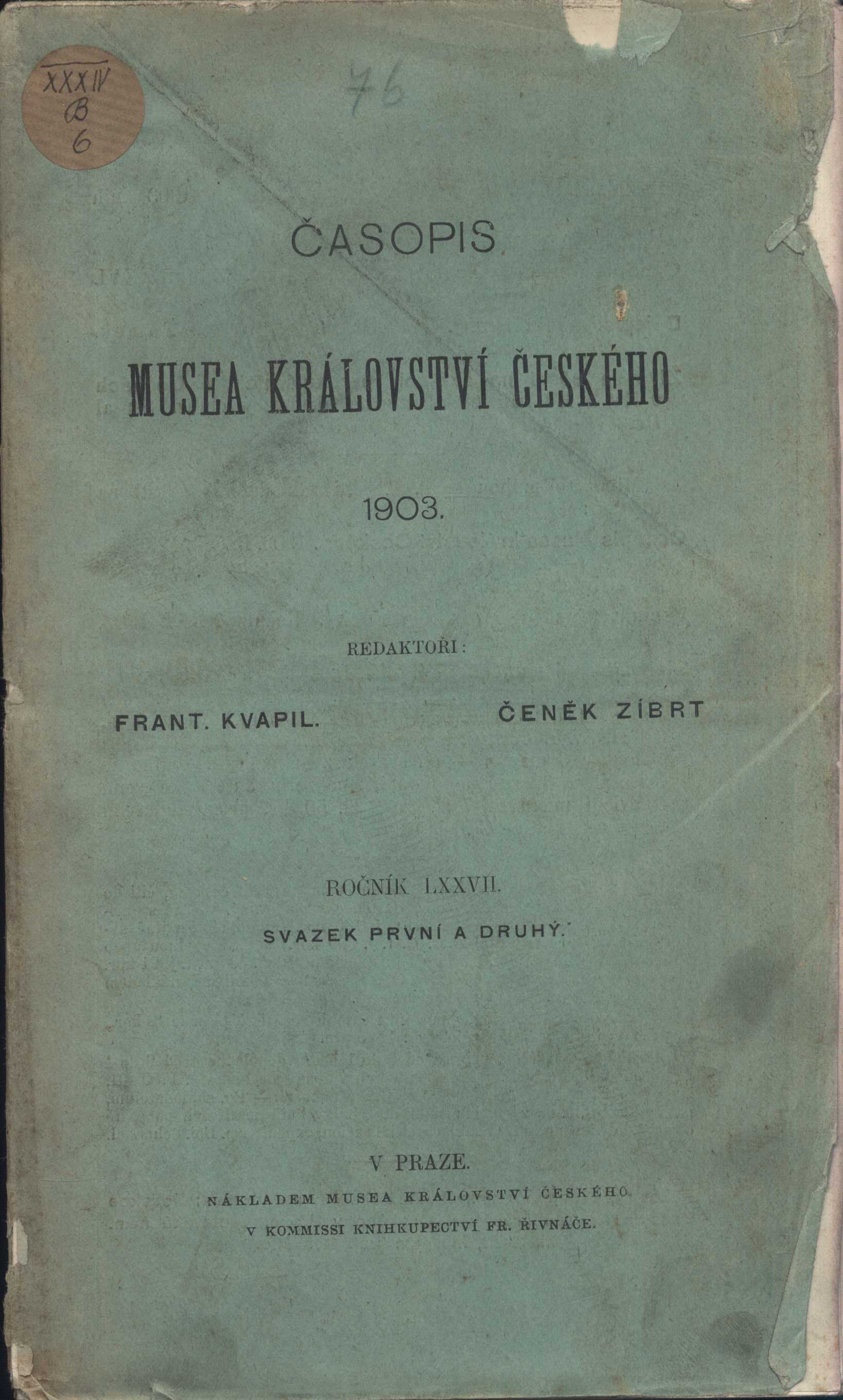 Title information Časopis Musea Království českého Další autoři Kvapil, František, 1855-1925 (Redactor) Zíbrt, Čeněk, 1864-1932 (Redactor) Corporation České museum (Praha, Česko) (Publisher) Unie (tiskárna) (Printer) Roč., číslo Ročník 77, svazek 1-6, 1903 Publication V Praze : nákladem Musea Království českého, 1903 Manufacture Tiskem Unie Scope 504 stran Country Czech Republic Language Czech Note Identicky zdobená obálka každého čísla