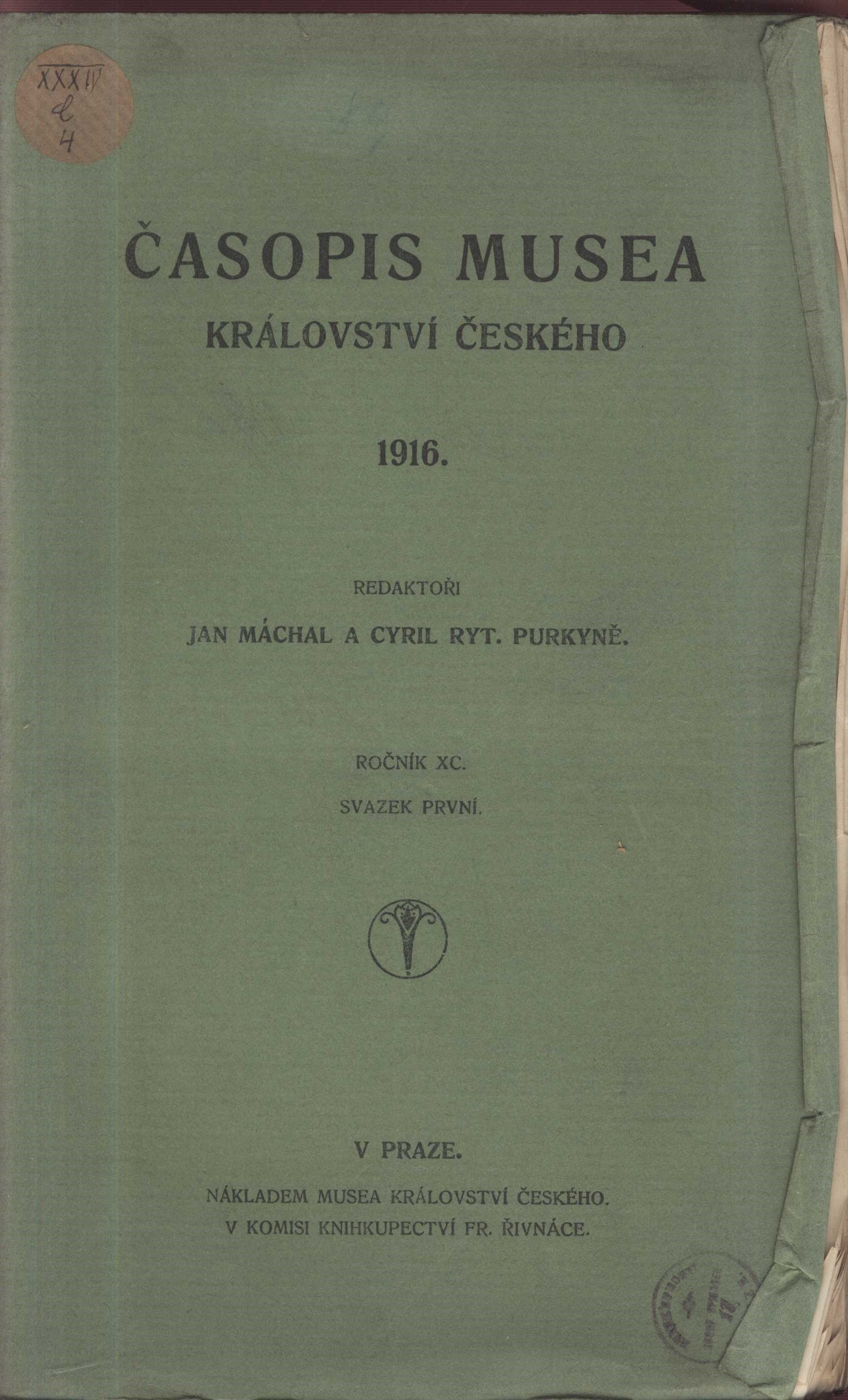 Title information Časopis Musea Království českého Další autoři Máchal, Jan, 1864-1924 (Redactor) Purkyně, Cyrill, 1862-1937 (Redactor) Corporation České museum (Praha, Česko) (Publisher) Pražská akciová tiskárna (Printer) Roč., číslo Ročník 90, svazek 1-4, 1916 Publication V Praze : nákladem Musea Království českého, 1916 Manufacture Pražská akciová tiskárna Scope 524 stran Country Czech Republic Language Czech Note Identická obálka každého čísla