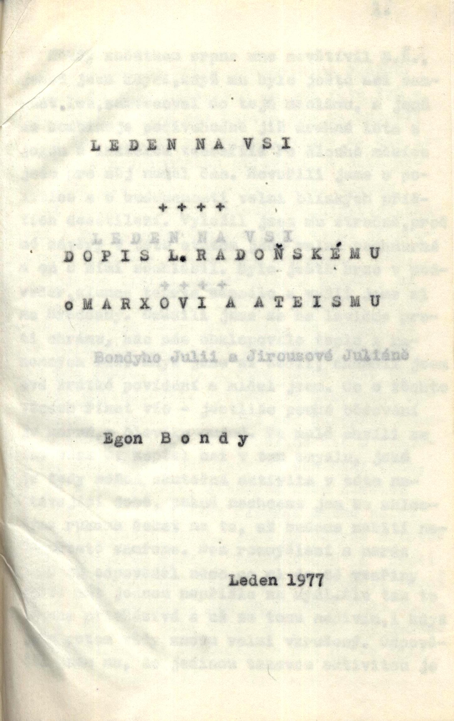 1. Title informationLeden na vsi : dopis Ladislavu Radoňskému o Marxovi a ateismu / Egon Bondy