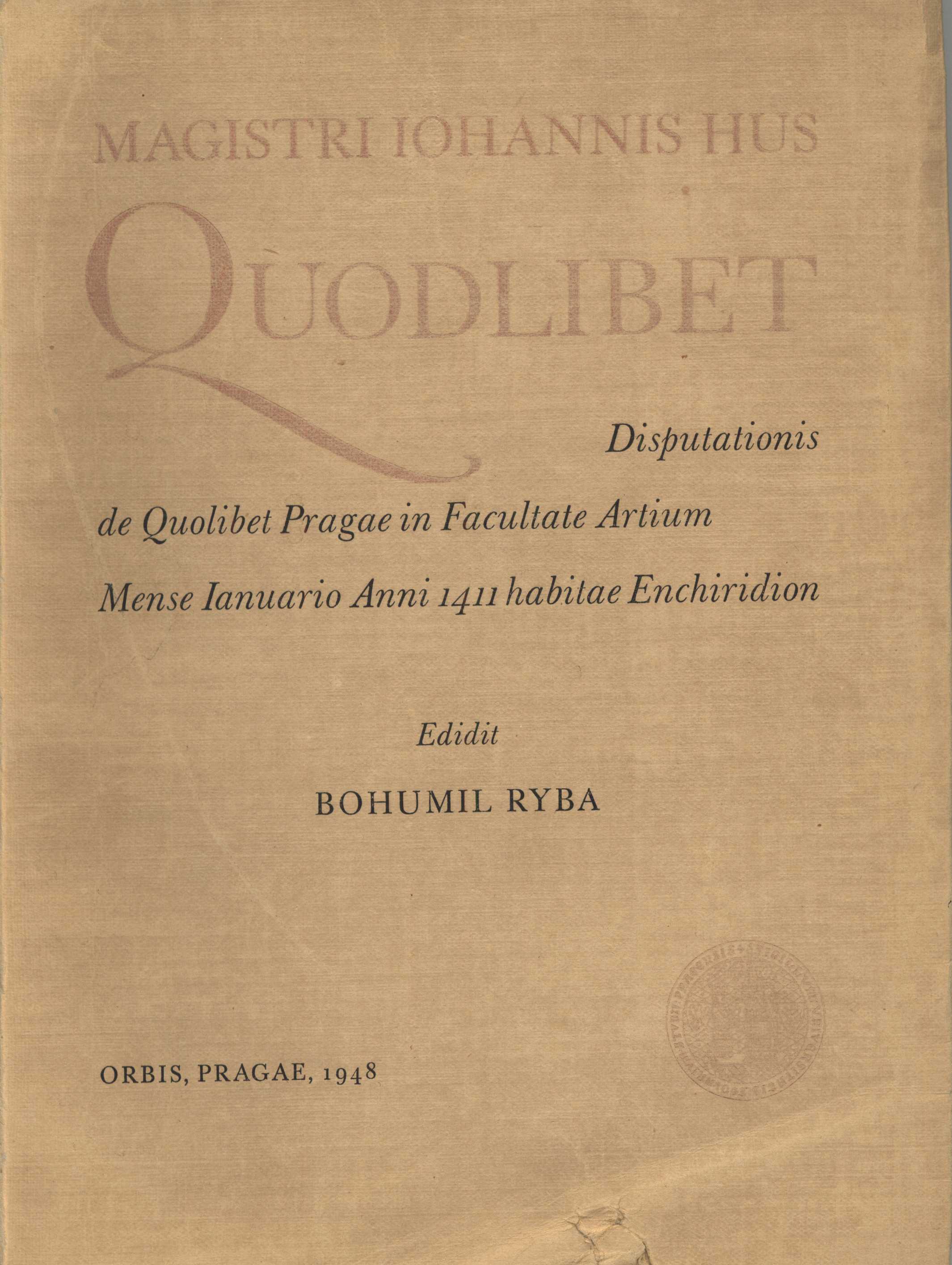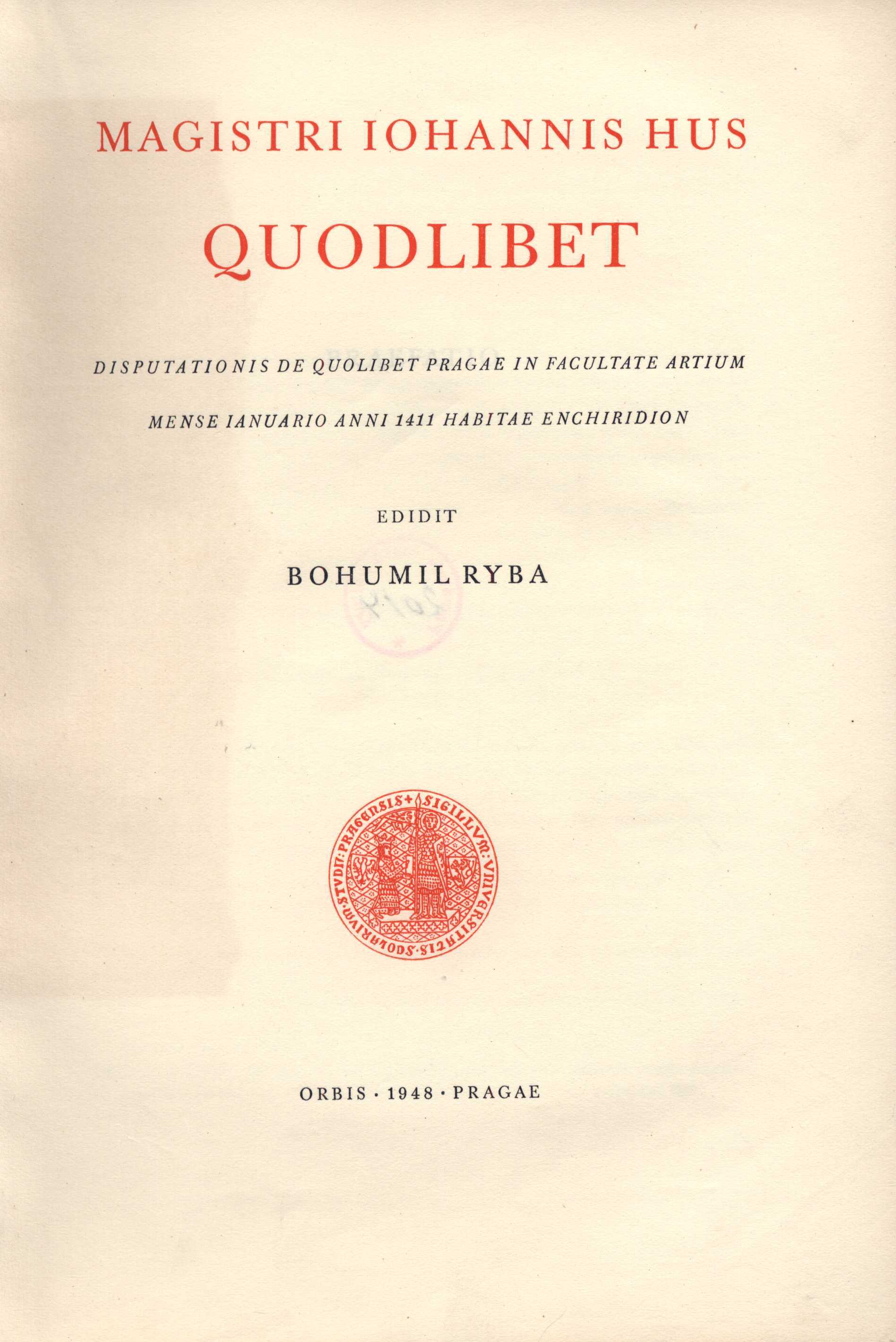Title information Magistri Iohannis Hus quodlibet : disputationis de quolibet Pragae in facultate artium mense Ianuario anni 1411 habitae enchirdion / edidit Bohumil Ryba Personal name Hus, Jan, asi 1371-1415 (Author) Další autoři Ryba, Bohumil, 1900-1980 (Editor) (Author of introduction) Corporation Orbis (firma) (Publisher) Publication Pragae : Orbis, 1948 Scope xxxi, 235 stran : faksimile ; 25,5 cm ISBN (Brožováno) Country Czech Republic Language Latin Note Typograficky řešená obálka. - Úvod a komentář B. Ryby. - Červený a černý tisk knihy. - Na frontispisu faksimile na křídovém papíru. - Poznámky pod čarou. - Obsahuje bibliografické odkazy a rejstřík. - Náklad 3500 výtisků.