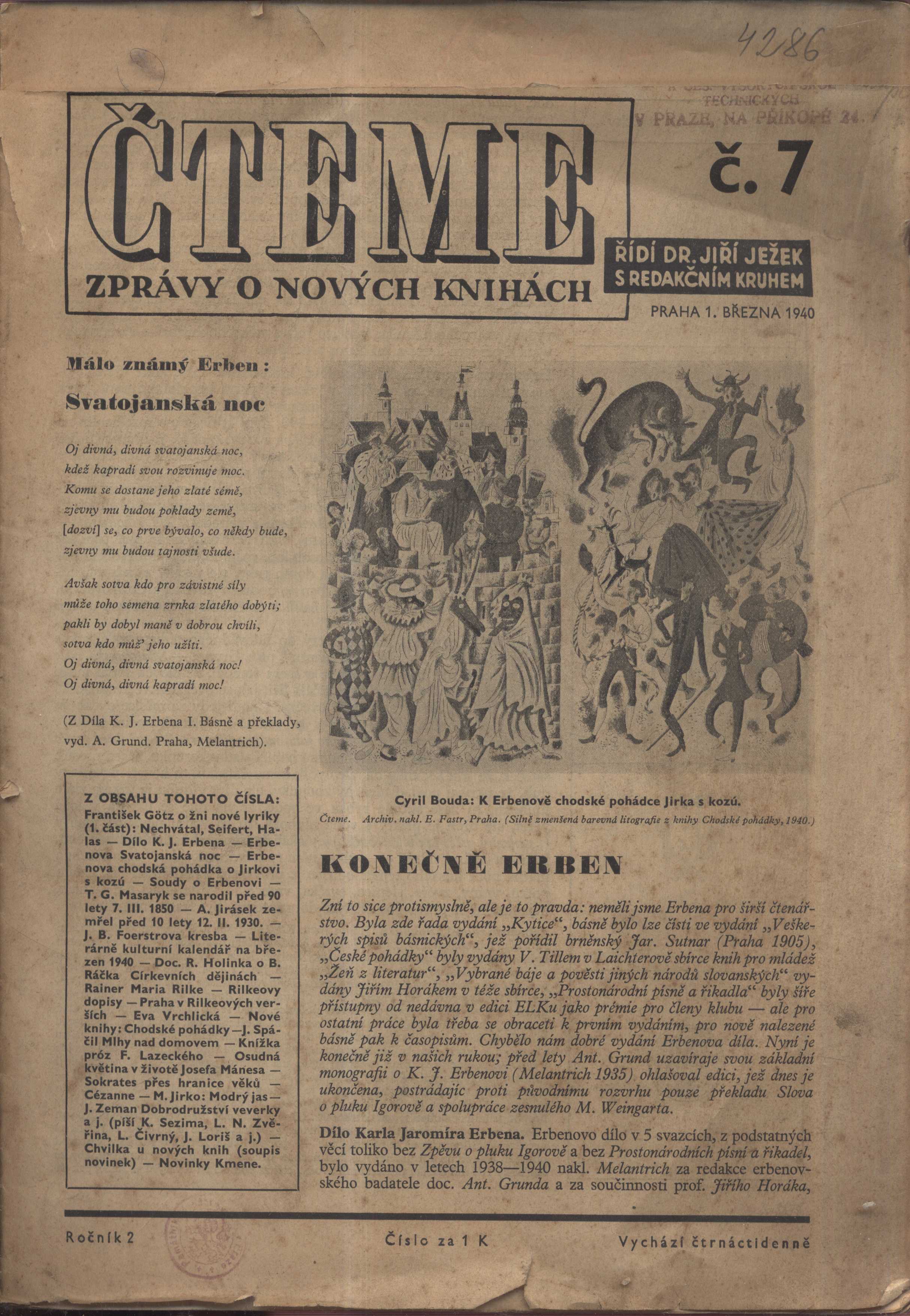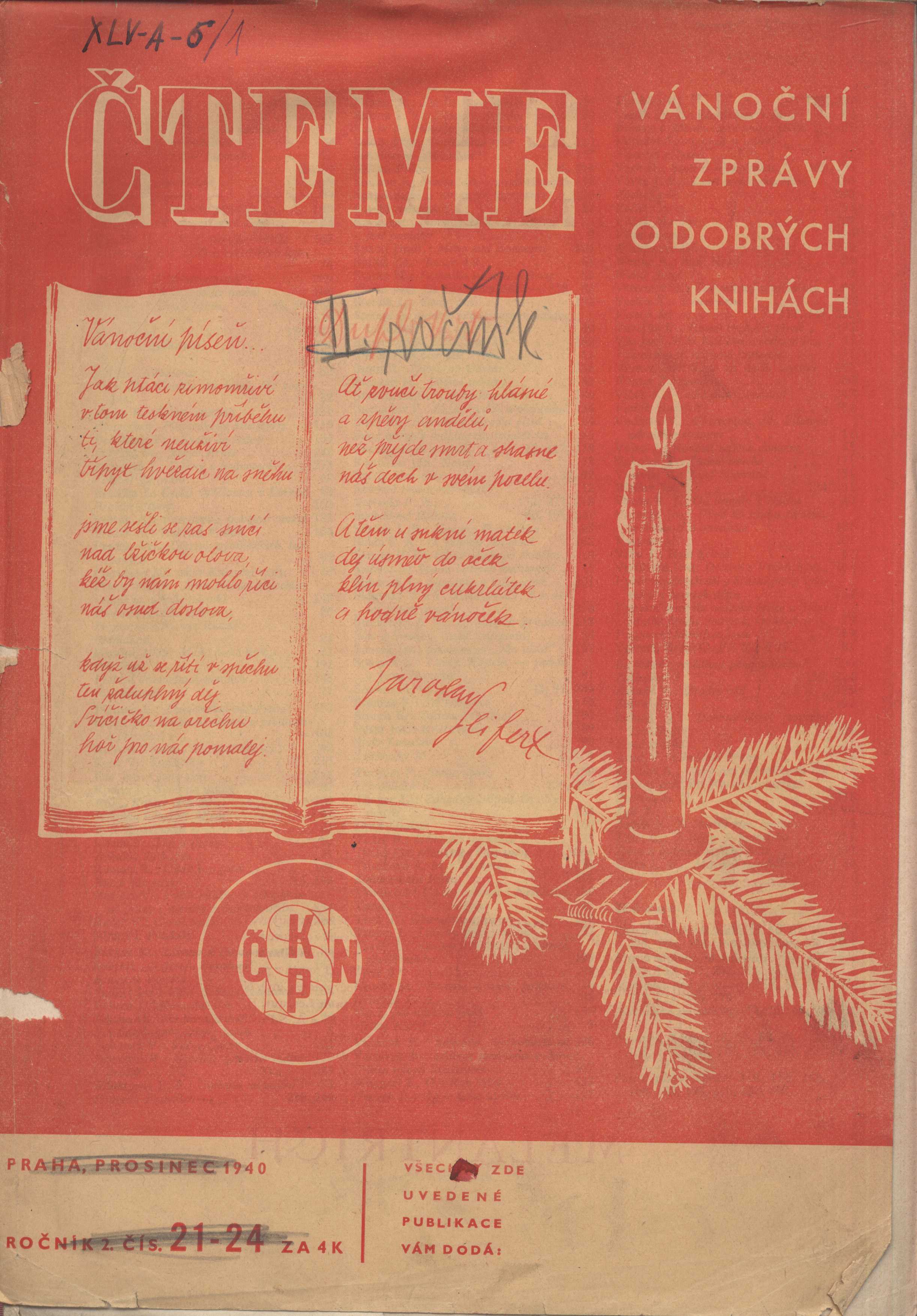 Title information Čteme : zprávy o nových knihách Další autoři Ježek, Jiří, 1901-1963 (Redactor) Kleinert, Jaroslav, 1882- (Redactor) Corporation Svaz českých knihkupců a nakladatelů (Publisher) Česká grafická Unie (tiskárna a nakladatelství) (Printer) Roč., číslo Ročník 2, číslo 1-24, 1939/1940 Publication V Praze : Svaz českých knihkupců a nakladatelů, 1939-1940 Scope 364 stran : ilustrace Country Czech Republic Language Czech Note Bez obálky. - Standardní zdobené záhlaví. - Černobílé ilustrace (reprodukce a fotografie). - Reklamy. - Bibliografické údaje. - Čtyřčíslo 21-24 je vánoční speciál s vlastní ozdobnou obálkou.