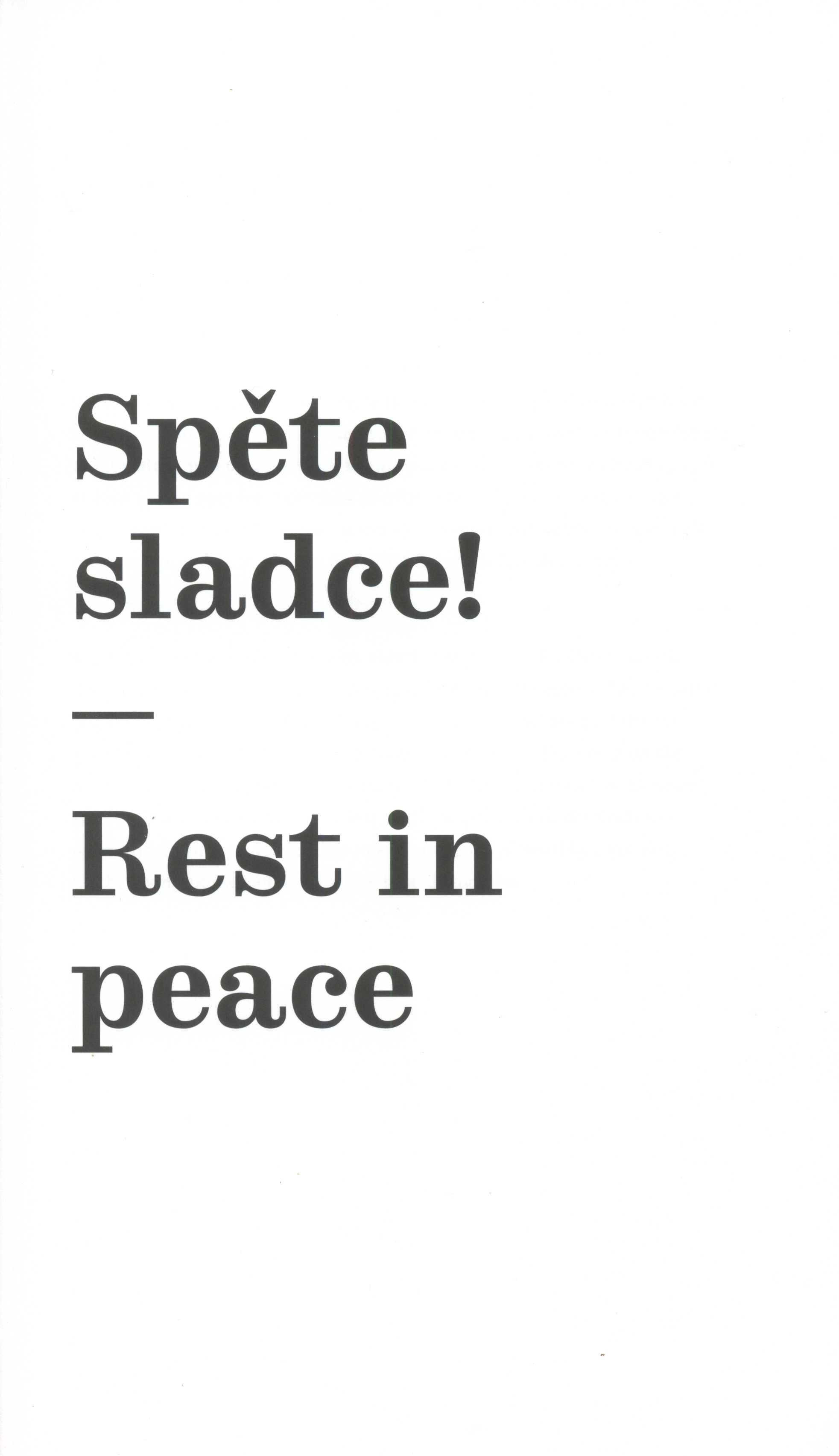 Title information Spěte sladce! : průvodce po hrobech českých typografů = Rest in peace : the tombstones of Czech typographers / koncepce, text: Matyáš Machat ; překlad: Elizabeth Spacilova ; fotografie: Eva Šmahelová ; grafická úprava: Matyáš Machat Personal name Machat, Matyáš, 1992- (Author) (Conceptor) (Book designer) Další autoři Walsh-Spáčilová, Elizabeth, 1970- (Translator) Šmahelová, Eva (Photographer) Machat, Matyáš, 1992- Spěte sladce! Machat, Matyáš, 1992- Spěte sladce!. Anglicky Corporation Vysoká škola uměleckoprůmyslová (vydavatelství) (Publisher) PBtisk (tiskárna) (Printer) Edition statement Vydání první Publication V Praze : Vysoká škola uměleckoprůmyslová, 2015 Manufacture Příbram : PBtisk a.s. Scope 175 nečíslovaných stran : ilustrace ; 30 cm + 1 mapa (59 x 51 cm složená na 30 x 17 cm) ISBN 978-80-87989-17-3 (brožováno) Country Czech Republic Language Czech * English Language of the original Czech Note Černá obálka se stříbrným textem. - Patitul. - Úvod. - Černobílé fotografie a faksimile (ukázky písma). - Medailonky typografů. - Závěr. - Poděkování. - Obsah. - V knize volně vložena složená mapa s umístěním hrobů na jednotlivých hřbitovech.