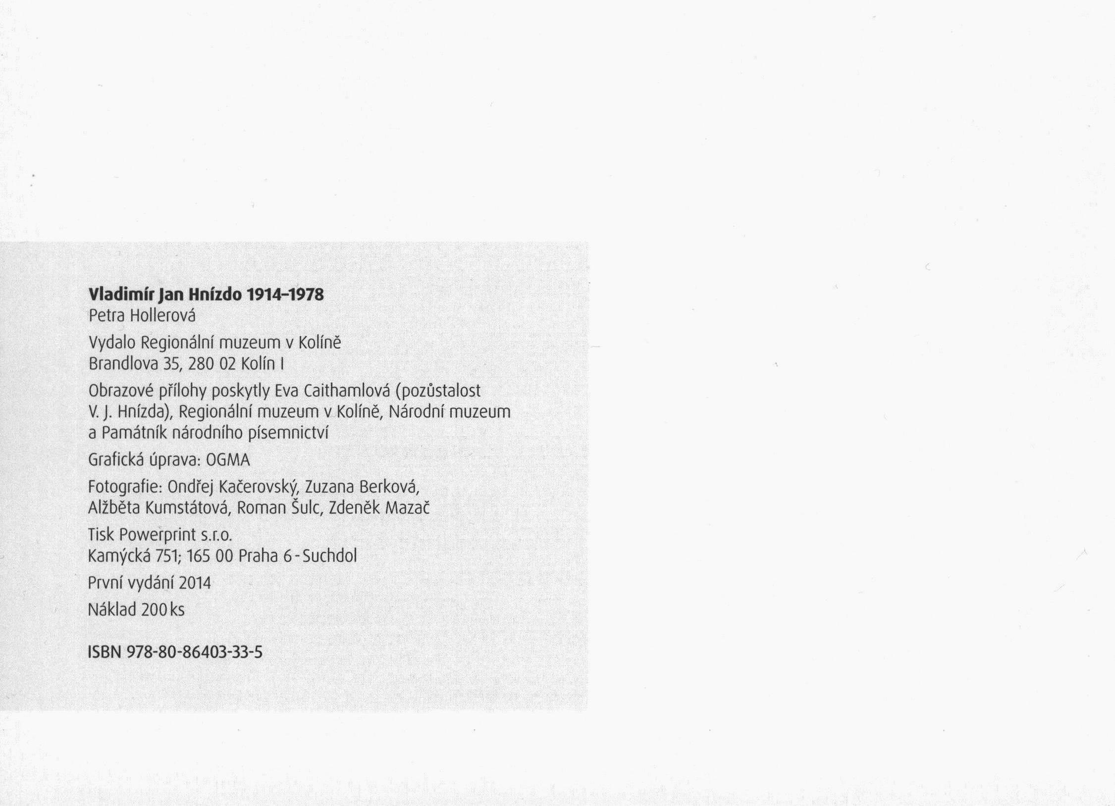 Note Vydáno u příležitosti výstavy "Vladimír Jan Hnízdo - pocta ke 100. výročí narození", která se uskutečnila v Regionálním muzeu v Kolíně, Červinkovském domě od 9.12.2014 do 15.3.2015