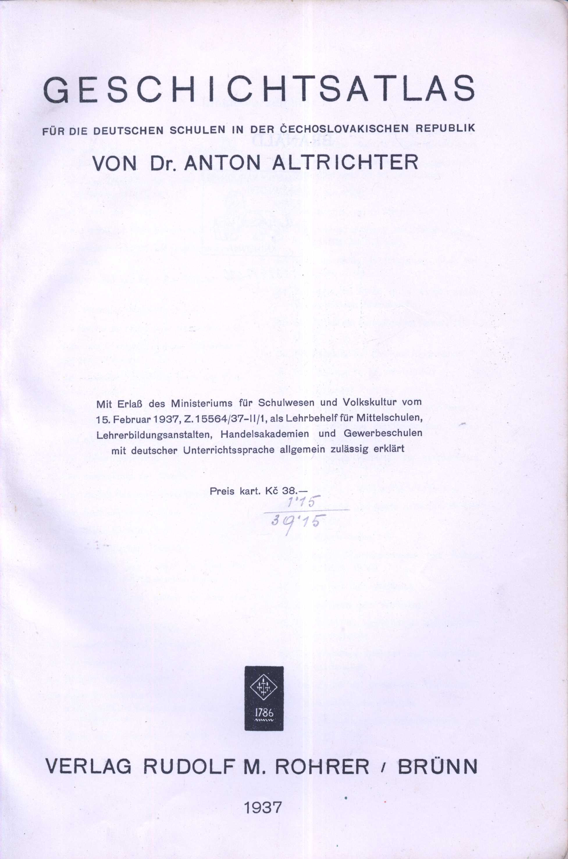 Title information Geschichtsatlas : für die deutschen Schulen in der Čechoslovakischen Republik / von Anton Altrichter Personal name Altrichter, Anton, 1882-1954 (Author) Publication Brünn : Rudolf M. Rohrer, 1937 Scope 52 stran : přibližně 53 barevných map ; 26 cm ISBN (brožováno) Country Czech Republic Language German Note Barevné historické mapy