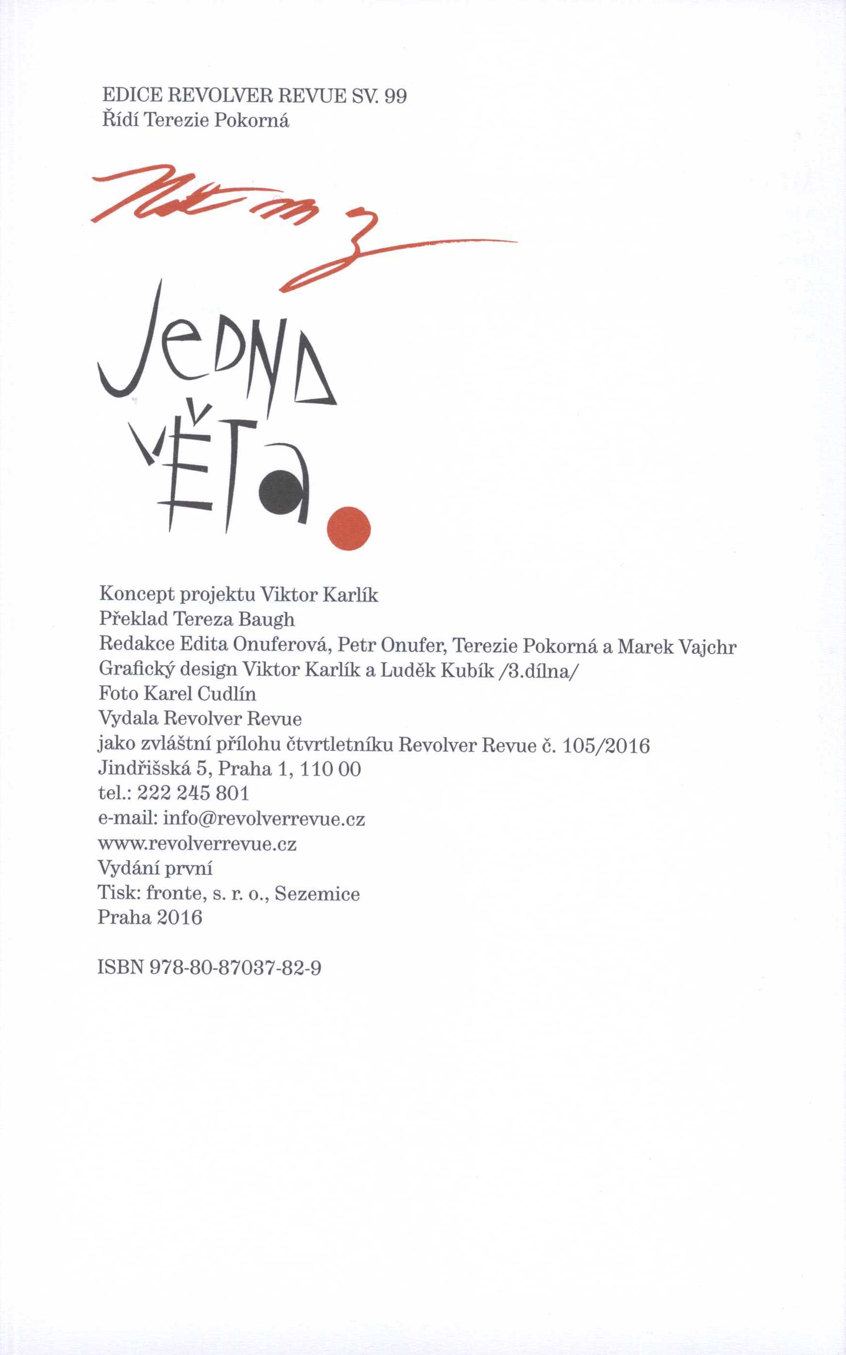 Title information Jedna věta / Mike Baugh ; překlad Tereza Baugh ; grafický design Viktor Karlík a Luděk Kubík ; foto Karel Cudlín Personal name Baugh, Mike (Author) Další autoři Baugh, Tereza (Translator) Karlík, Viktor, 1962- (Book designer) (Author of introduction) (Editor) Kubík, Luděk, 1963- (Book designer) Cudlín, Karel, 1960- (Photographer) Corporation Revolver Revue (nakladatelství) (Publisher) Edition statement Vydání první Publication Praha : Revolver Revue, 2016 Manufacture Sezemice : Fronte, s. r. o. Scope 43 stran : portrét ; 24 cm ISBN 978-80-87037-82-9 (brožováno) Edition Edice Revolver Revue ; svazek 99