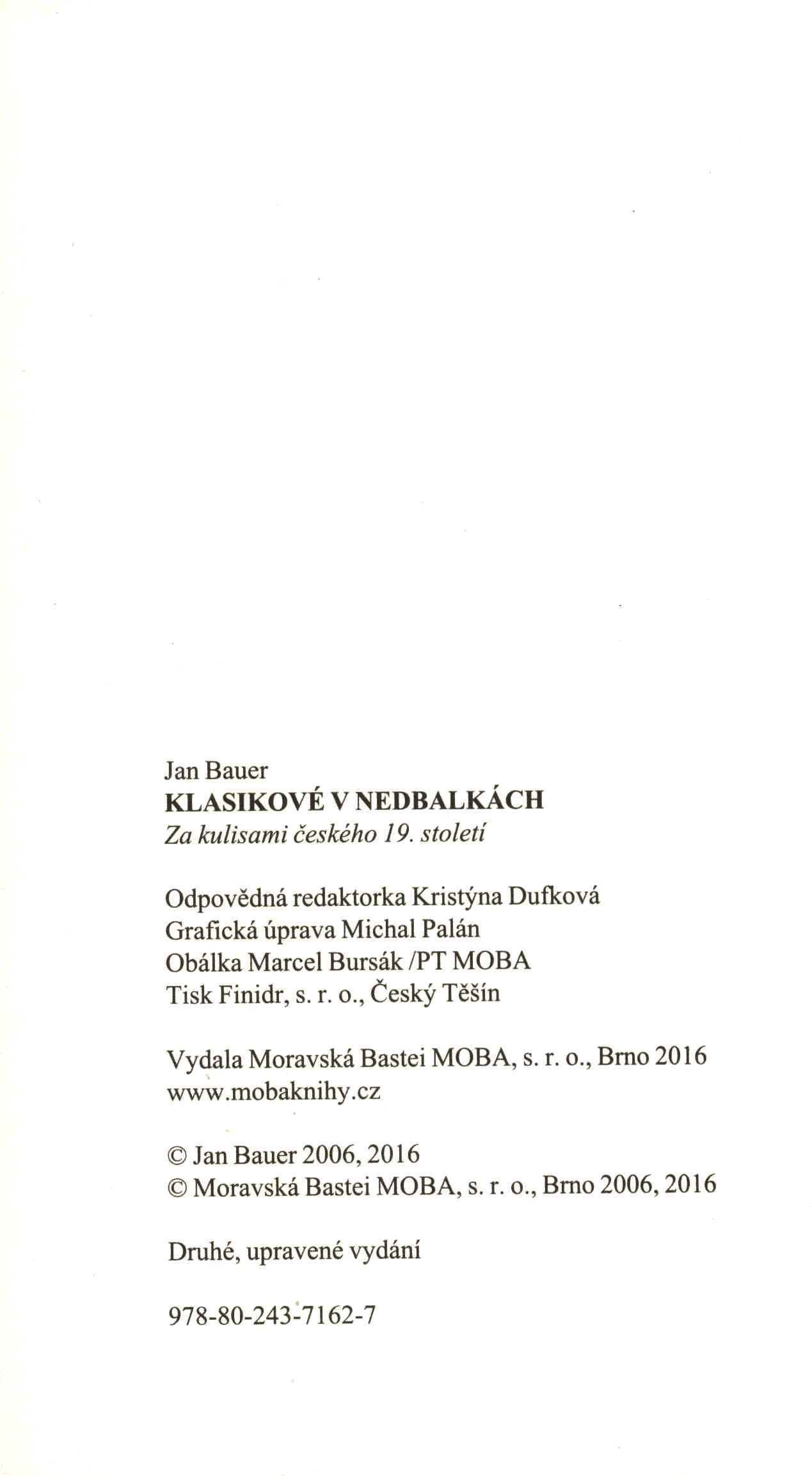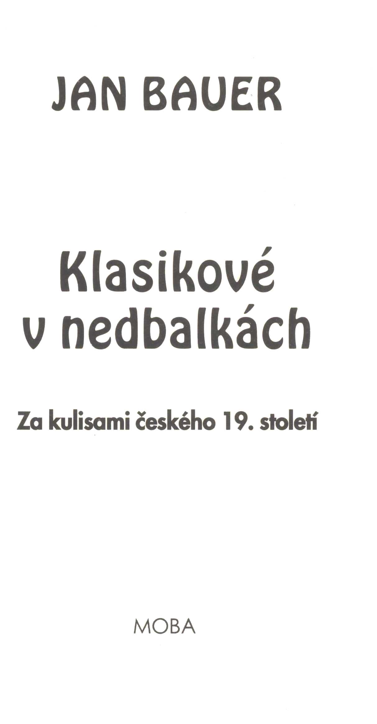 Title information Klasikové v nedbalkách : za kulisami českého 19. století / Jan Bauer ; grafická úprava Michal Palán ; obálka Marcel Bursák/PT MOBA Personal name Bauer, Jan, 1945-2025 (Author) Další autoři Palán, Michal, 1987- (Book designer) Bursák, Marcel (Bookjacket designer) Edition statement Druhé, upravené vydání Publication Brno : MOBA, 2016 Manufacture Český Těšín : Finidr, s. r. o. Scope 254 stran ; 21 cm ISBN 978-80-243-7162-7 (vázáno) Country Czech Republic Language Czech Note Zdobená barevná vazba. - Nakladatelská značka na vakátě. - Tiráž na místě frontispisu. - Úvod autora. - Příběhy. - Chronologie událostí 19. století v Čechách a na Moravě. - Obsahuje bibliografii. - Obsah. - Na zadní straně vazby tónované portréty, anotace knihy a nakladatelská značka.