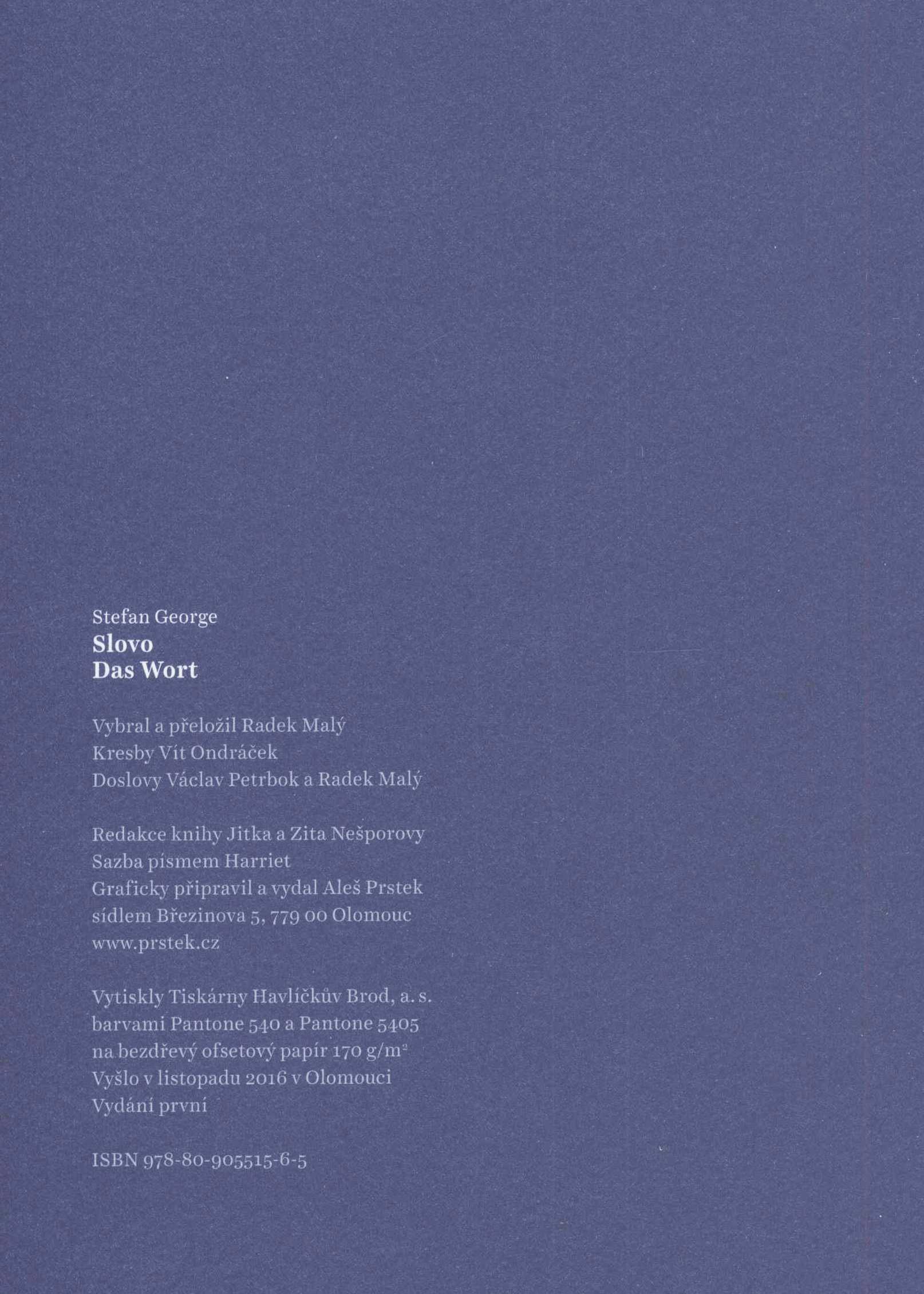 Title information Slovo = Das Wort / Stefan George ; vybral a přeložil Radek Malý ; kresby Vít Ondráček ; doslovy Václav Petrbok a Radek Malý ; graficky připravil a vydal Aleš Prstek Personal name George, Stefan, 1868-1933 (Author) Další autoři Malý, Radek, 1977- (Translator) Ondráček, Vít, 1959- (Illustrator) Petrbok, Václav, 1972- (Author of afterword, colophon, etc.) Prstek, Aleš, 1976- (Book designer) (Publisher) Corporation Tiskárny Havlíčkův Brod (firma) (Printer) Nakladatelství Aleš Prstek (Publisher) Edition statement Vydání první Publication Olomouc : Aleš Prstek, 2016 Manufacture Havlíčkův Brod : Tiskárny Havlíčkův Brod a.s. Scope 111 stran : ilustrace ; 21 cm ISBN 978-80-905515-6-5 (vázáno) Country Czech Republic Language Czech * German Language of the original German Note Barevná zdobená obálka a záložky, bílý text (i na hřbetu). - Barevné zdobené předsádky. - Patitul. - Básně. - Bílý tisk a kresby na barevném papíru. - Doslov "George" V. Petrbok. - Doslov "Recepce poezie stefana Georga v českých zemích" R. Malý. - Ediční poznámka. - Obsah. - Přebal.
