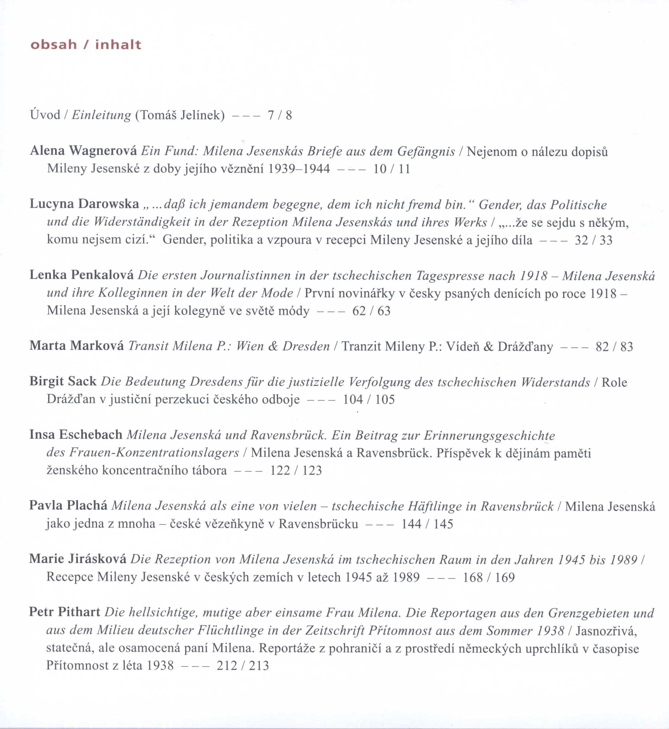 Title information Milena Jesenská : biografie, historie, vzpomínky : česko-německá konference 2014 = Biografie, Zeitgeschichte, Erinnerung : Deutsch-Tschechische Konferenz 2014 Pavla Plachá, Věra Zemanová (edd.) ; autoři textů: Lumír Čivrný, Lucyna Darowska, Insa Eschenbach, Eduard Goldstücker, Tomáš Jelínek, Marie Jirásková, Marta Marková, Lenka Penkalová, Petr Pithart, Pavla Plachá, Birgit Sack, Alena Wagnerová ; překlad z němčiny: Pavla Plachá, Věra Zemanová, překlad z češtiny: Thomas Kirschner, Věra Zemanová Personal name Čivrný, Lumír, 1915-2001 (Author) Další autoři Darowska, Lucyna (Author) Eschebach, Insa, 1954- (Author) Goldstücker, Eduard, 1913-2000 (Author) Jelínek, Tomáš, 1975- (Author) Jirásková, Marie, 1938- (Author) Marková, Marta, 1947- (Author) Penkalová, Lenka, 1979- (Author) Pithart, Petr, 1941- (Author) Plachá, Pavla, 1976- (Author) (Editor) (Translator) Sack, Birgit, 1965- (Author) Wagnerová, Alena, 1936- (Author) Kirschner, Věra, 1974- (Editor) Kirschner, Thomas (Translator) Corporation Historický servis (společnost) (Publisher) Aula (nakladatelství) (Publisher) Edition statement Vydání první Publication Praha : Aula, 2016 Scope 273 stran : ilustrace (některé barevné), portréty, faksimile ; 21 cm ISBN 978-80-86751-31-3 (brožováno) Country Czech Republic Language Czech * German Language of the original Czech * German Note Zdobená barevná obálka. - Na záložce obálky poznámka o knize. - Frontispis. - Souběžný německý text. - Barevné, tónované a černobílé fotografie, portréty a faksimile s popiskami. - Obsahuje bibliografii, bibliografické odkazy a rejstřík. - Obsah.