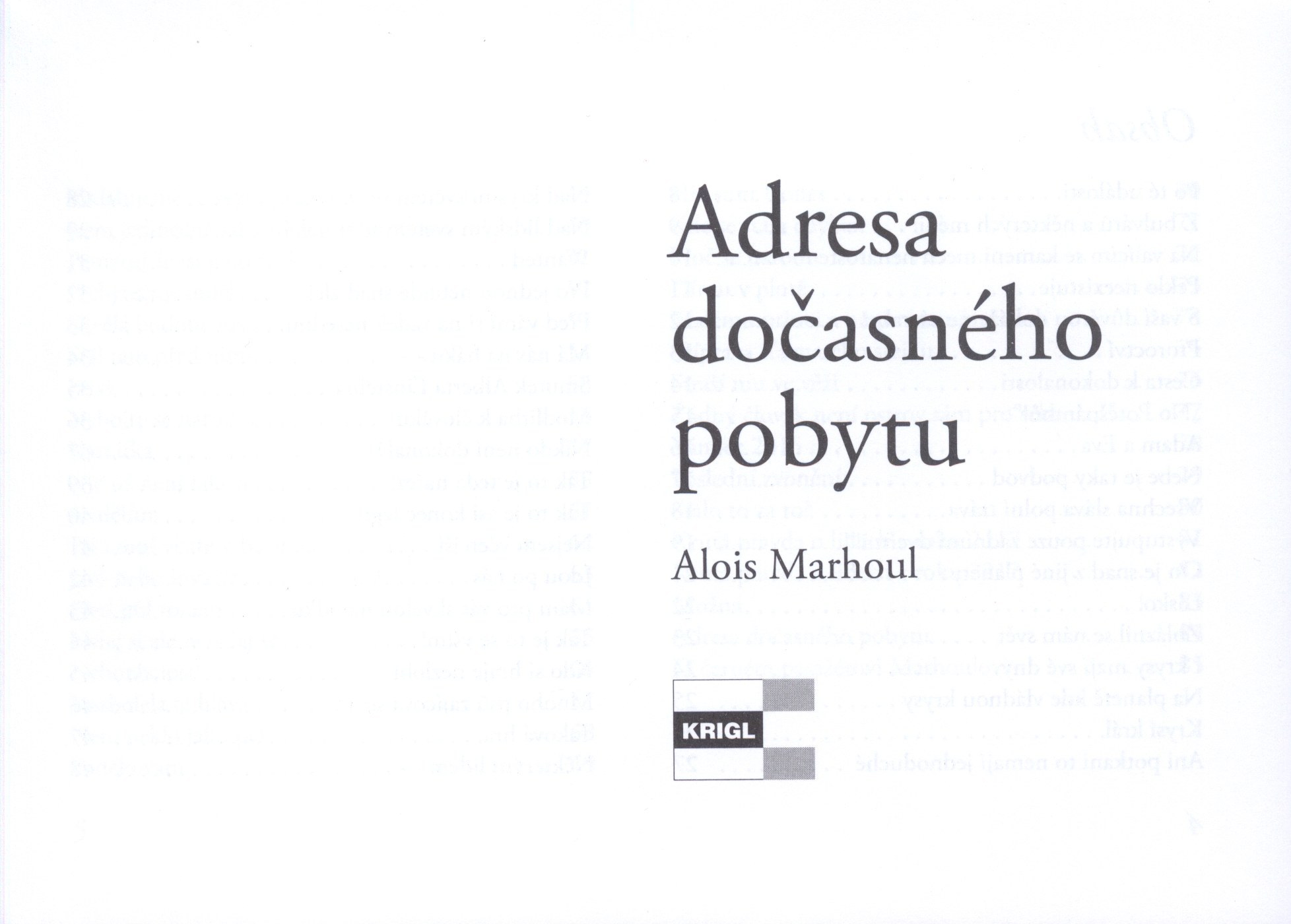 Title information Adresa dočasného pobytu / Alois Marhoul Personal name Marhoul, Alois, 1951-2024 (Author) Další autoři Všetička, František, 1932- (Author of afterword, colophon, etc.) Corporation Krigl (nakladatelství) (Publisher) Edition statement 1. vydání Publication Praha : Krigl, 2017 Scope 86 stran ; 13 x 19 cm ISBN 978-80-88104-24-7 (vázáno) Country Czech Republic Language Czech Note Doslov František Všetička