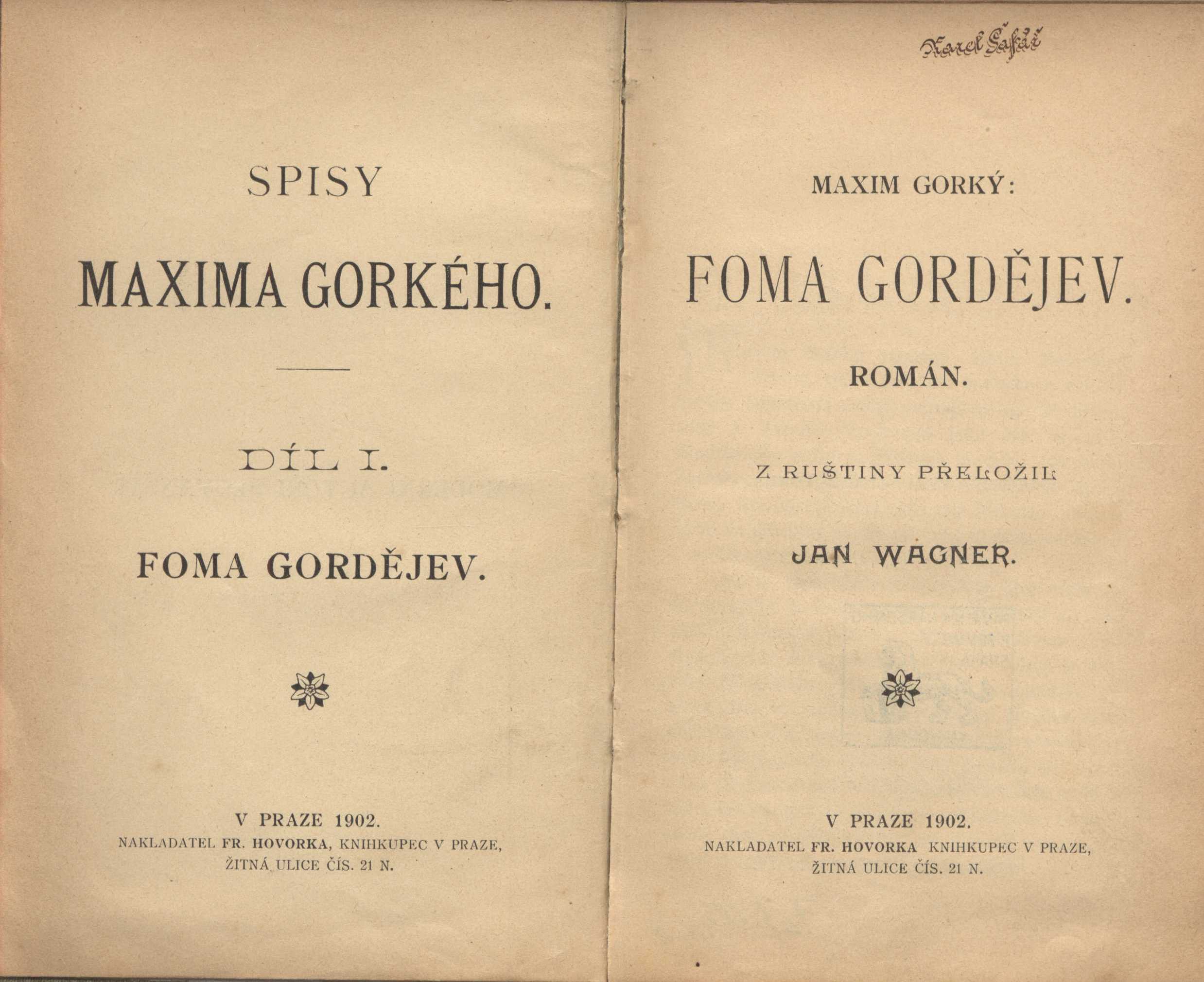 Spisy, Maxim Gorkij, (Fr. Hovorka)Country Czech Republic Language Czech Language of the original Russian Note Vl. jm. autora: Peškov, Aleksej Maksimovič. - Rozložený titulní list. - Přehled titulů vydaných v edici.