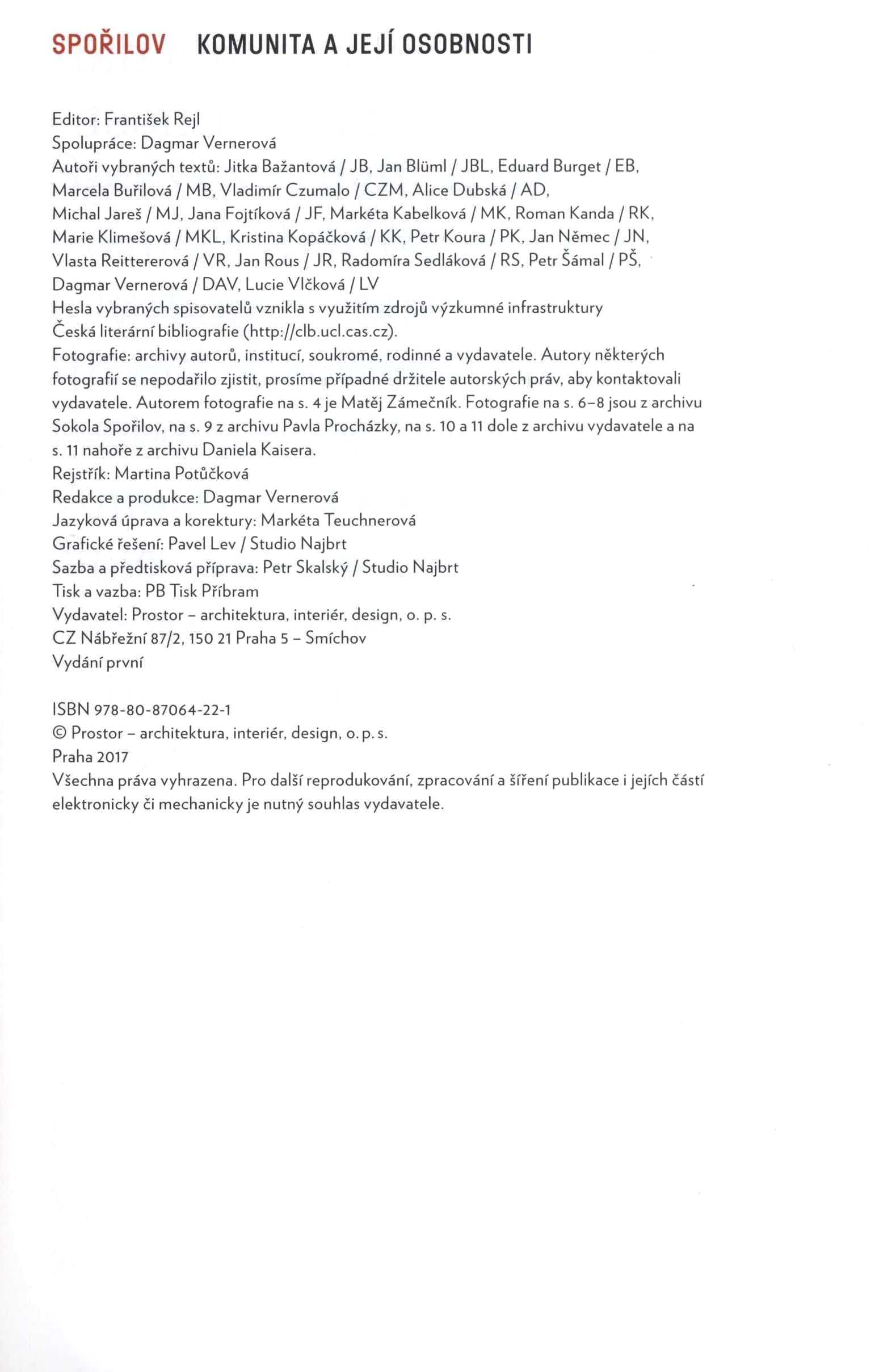 Title information Spořilov : komunita a její osobnosti / František Rejl, Dagmar Vernerová (eds). ; Jitka Bažantová, Jan Blüml, Eduard Burget, Marcela Buřilová, Vladimír Czumalo, Alice Dubská, Jana Fojtíková, Michal Jareš, Markéta Kabelková, Roman Kanda, Marie Klimešová, Kristina Kopáčková, Petr Koura, Jan Němec, Vlasta Reittererová, Jan Rous, Radomíra Sedláková, Petr Šámal, Dagmar Vernerová, Lucie Vlčková ; grafické řešení: Pavel Lev / Studio Najbrt. Personal name Bažantová, Jitka (Author) Další autoři Blüml, Jan, 1980- (Author) Burget, Eduard, 1972-2023 (Author) Buřilová, Marcela, (Author) 1956- Czumalo, Vladimír, 1954-2024 (Author) Dubská, Alice, 1938- (Author) Fojtíková, Jana, 1944- (Author) Jareš, Michal, 1973- (Author) Kabelková, Markéta, 1962- (Author) Kanda, Roman, 1976- (Author) Klimešová, Marie, 1952- (Author) Kopáčková, Kristina (Author) Koura, Petr, 1978- (Author) Němec, Jan, 1953- (Author) Reittererová, Vlasta, 1947- (Author) Rous, Jan, 1943- (Author) Sedláková, Radomíra, 1950- (Author) Šámal, Petr, 1972- (Author) Vernerová, Dagmar, 1958- (Author) (Editor) Vlčková, Lucie, 1975- (Author) Rejl, František, 1938- (Editor) Branald, Adolf, 1910-2008 (Author) Fárová, Anna, 1928-2010 (Author of afterword, colophon, etc.) Lev, Pavel, 1954- (Book designer) Corporation Prostor - architektura, interiér, design (nakladatelství) (Publisher) PBtisk (tiskárna) (Printer) (Binder) Edition statement Vydání první Publication Praha : Prostor - architektura, interiér, design, 2017 Manufacture Příbram : PB Tisk Scope 133 stran : ilustrace, portréty ; 21 cm ISBN 978-80-87064-22-1 (brožováno) Country Czech Republic Language Czech Note Oranžová zdobená obálka s hnědým textem. - Na rubu přední strany obálky poděkování vydavatele. - Dvoubarevný text a znak Městské části Praha 4 na titulním listu. - Báseň A. Branalda "Převleky mého města". - Doslov "Dvě tváře" od A. Fárové. - Poznámka vydavatele. - Černobílé fotografie, portréty. - Na rubu zadní strany obálky přehled knih o Spořilovu. - Anotace knihy na zadní straně obálky.