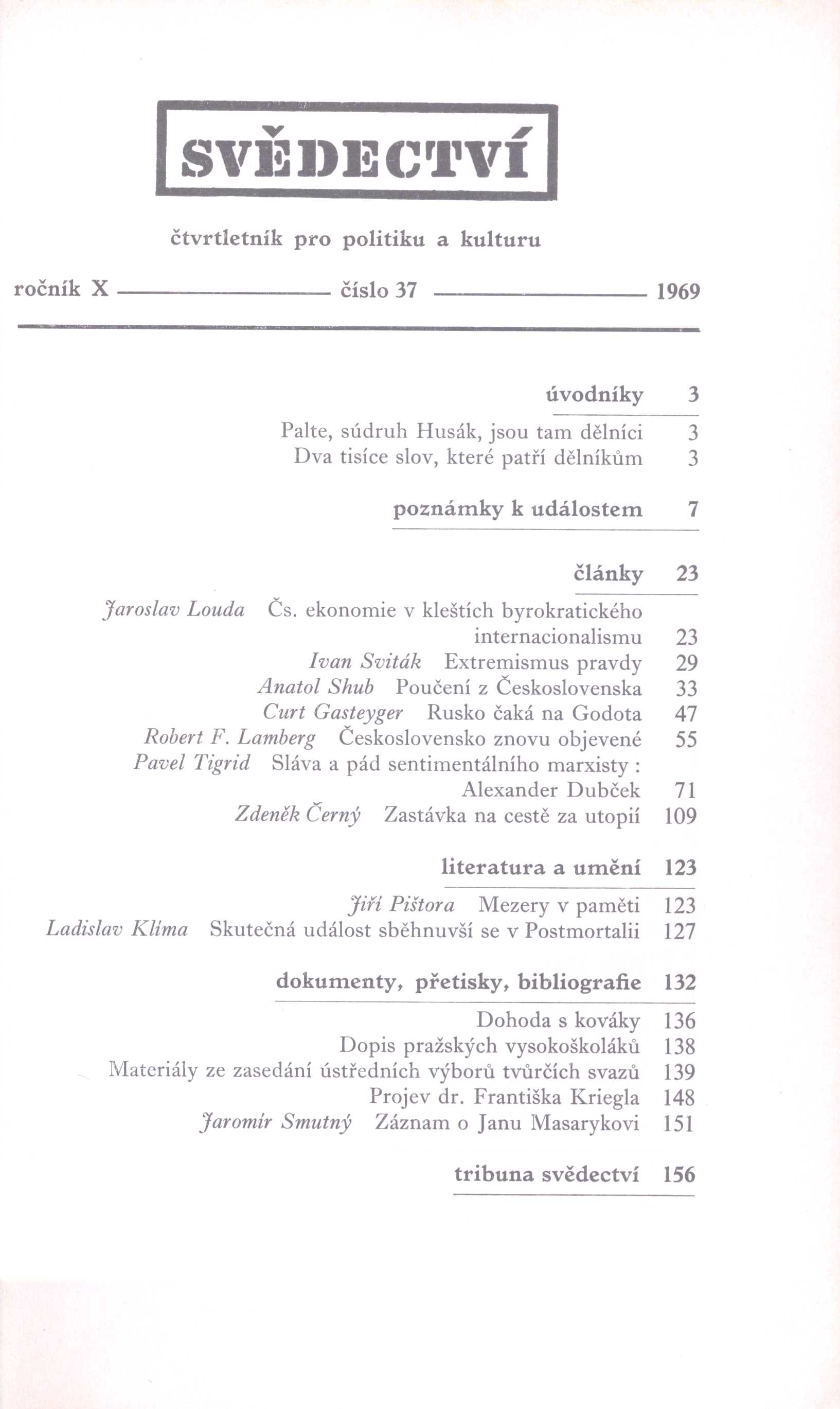 Title information Svědectví : čtvrtletník pro politiku a kulturu Další autoři Tigrid, Pavel, 1917-2003 (Editor) Roč., číslo Ročník 10, číslo 37, 1969 Publication Paris ; New York ; Wien : [Svědectví], 1969 Scope 156 stran ; 24 cm Country France * United States * Austria Language Czech Poznámka o dalších původcích Redaktor: Pavel Tigrid Redakční rada: Jan Čep, Josef Jonáš, Emil Kovtun, Radomír Luža, Mojmír Povolný, Vilém Brzorád, Pavel Tigrid Document kind PERIODIKA - Svázaný ročník periodika Periodicita čtvrtletně Internal Bibliographies/Indexes Note Obsahuje bibliografické odkazy Parent Svědectví Keywords politika * kultura * literatura * exil * třetí odboj * r. 1969 * exilový časopis UDC 32 * 008 Uživatelské pole PNP Sign. M 210 a 31: brožovaný svazek Call number Track No. Location Info M 210 a 31 6026/91 Sbírka
