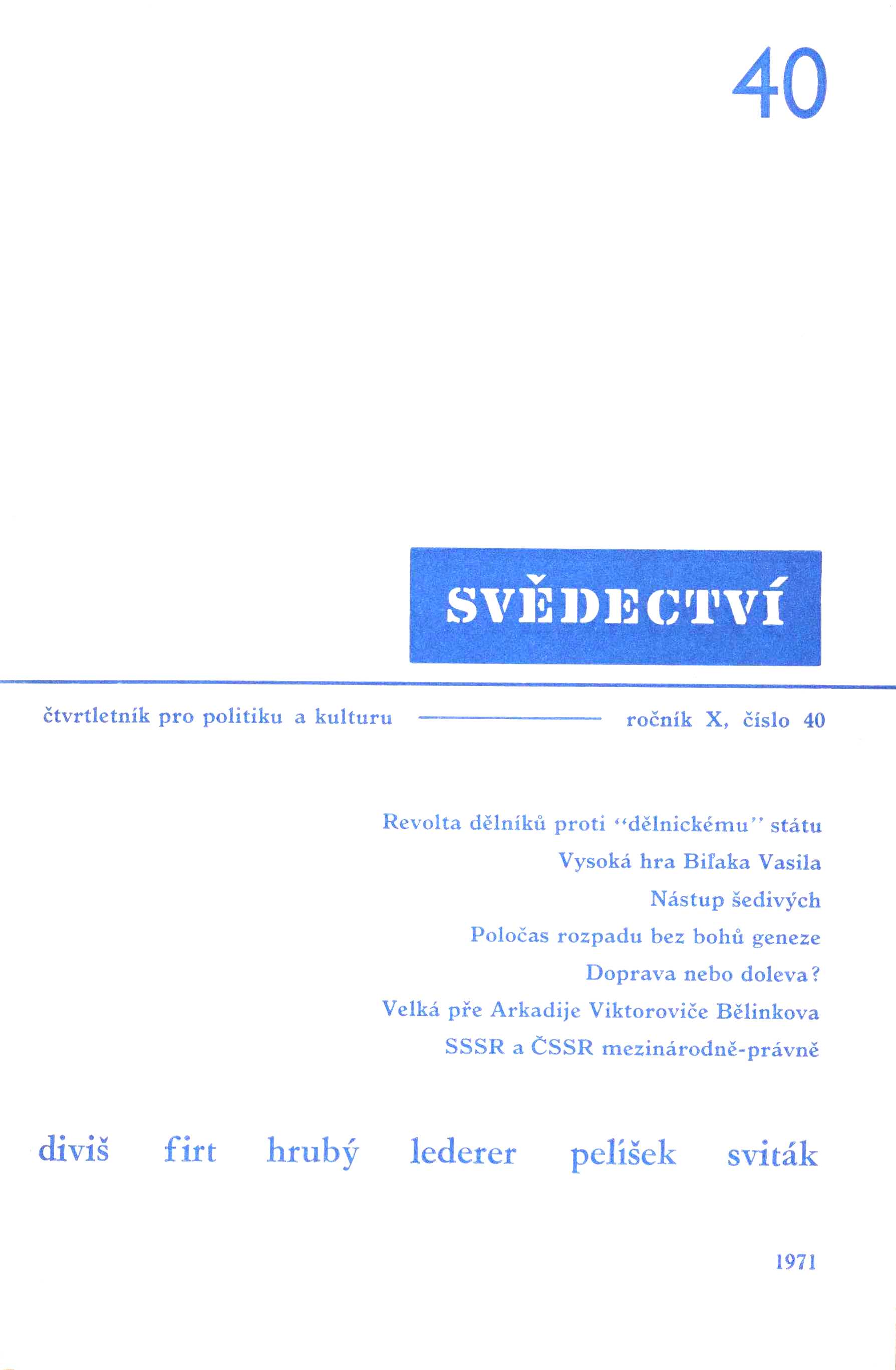 Názvové údaje Svědectví : čtvrtletník pro politiku a kulturu Další autoři Tigrid, Pavel, 1917-2003 (Editor) Sutnar, Ladislav, 1897-1976 (Knižní grafik) Roč., číslo Ročník 10, číslo 40, 1971 Nakladatel Paris ; New York ; Wien : [Svědectví], 1971 Rozsah Strana 499-655 ; 24 cm ISSN 0039-6419 Země vyd. Francie * Spojené státy americké * Rakousko Jazyk dok. čeština Poznámky 40