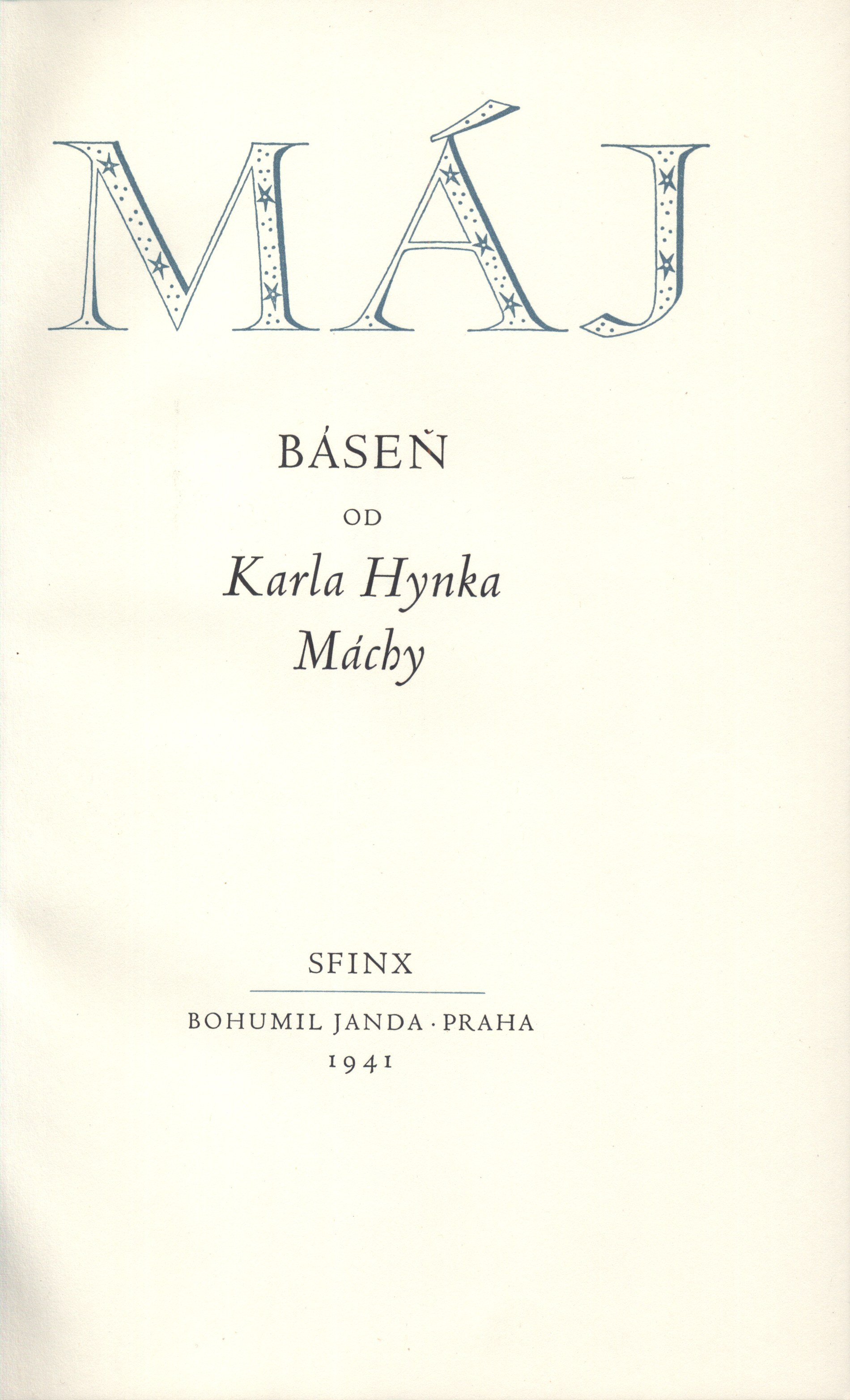 Title information Máj : báseň od Karla Hynka Máchy Personal name Mácha, Karel Hynek, 1810-1836 (Author) Další autoři Vyskočil, Albert, 1890-1966 (Redactor) (Author of afterword, colophon, etc.) (Dedicator) (Inscriber) Zrzavý, Jan, 1890-1977 (Illustrator) Menhart, Oldřich, 1897-1962 (Typographer) Vyskočilová, Emilie, 1888-1962 (Dedicatee) Corporation Nakladatelství B. Janda - Sfinx (Publisher) V. Neubert a synové (firma) (Printer of plates) Průmyslová tiskárna v Praze (Printer) Další var.názvy Máj : báseň Publication Praha : Sfinx, Bohumil Janda, 1941 Manufacture V Praze : Průmyslová tiskárna Scope 87 stran, 7 nečíslovaných listů obrazové přílohy : ilustrace ; 28 cm ISBN (Vázáno) Edition Knihovna Mistrů ; 5. svazek