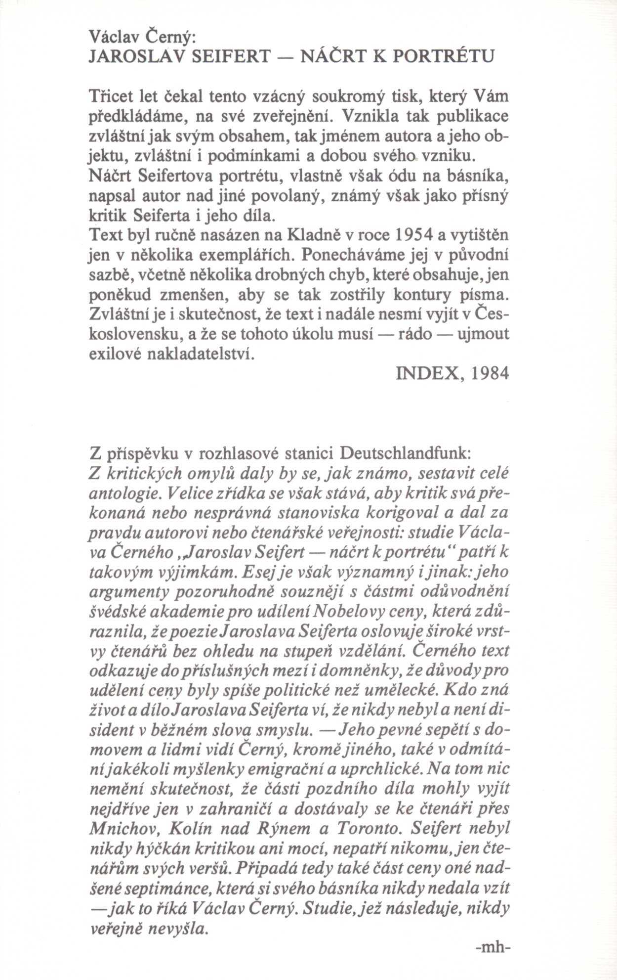 Title information Jaroslav Seifert : náčrt k portrétu ; úvodní proslov k večeru J. Seiferta, konaném 10. května 1954 / Václav Černý ; podobizna J. Seiferta v mědirytině od Cyrila Boudy ; v ručním lisu písmem cicero Bodoni vytiskl jako rukopis Josef Cipra Personal name Černý, Václav, 1905-1987 (Author) (Inscriber) Další autoři Bouda, Cyril, 1901-1984 (Illustrator) (Artist) Cipra, Josef, 1894-1970 (Compositor) Corporation Index (nakladatelství) (Publisher) Nadace Charta 77 (Publisher) Manufacture Kolín nad Rýnem : INDEX, 1984 Scope 21 stran : ilustrace ; 17 cm Country Czech Republic Language Czech Note Reprint. - Bílá obálka s červenými iniciálami, černým názvem nakladatelství a s nakladatelskou značkou. - Text a nakladatelská značka na vakátě. - Frontispis (portrét J. Seiferta). - V tiráži ruční podpis V. Černého. - Na zadní záložce text o knize a část rozhlasového příspěvku.