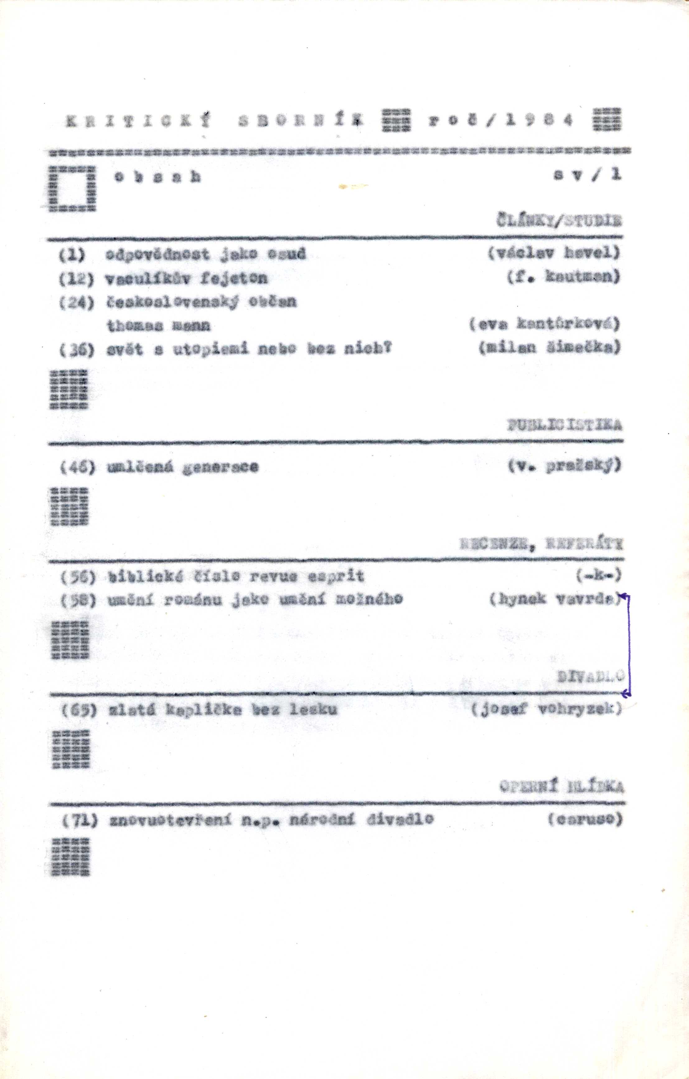 Keywords česká literatura * filozofie * články * studie * eseje * recenze * zprávy * samizdat * r. 1984 * samizdatový časopis