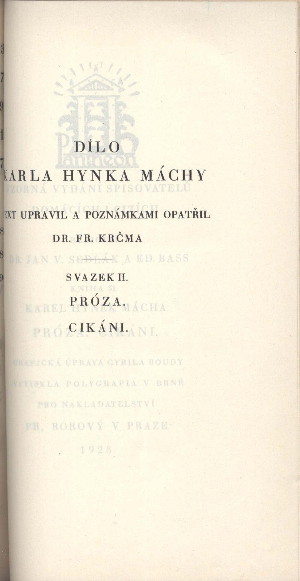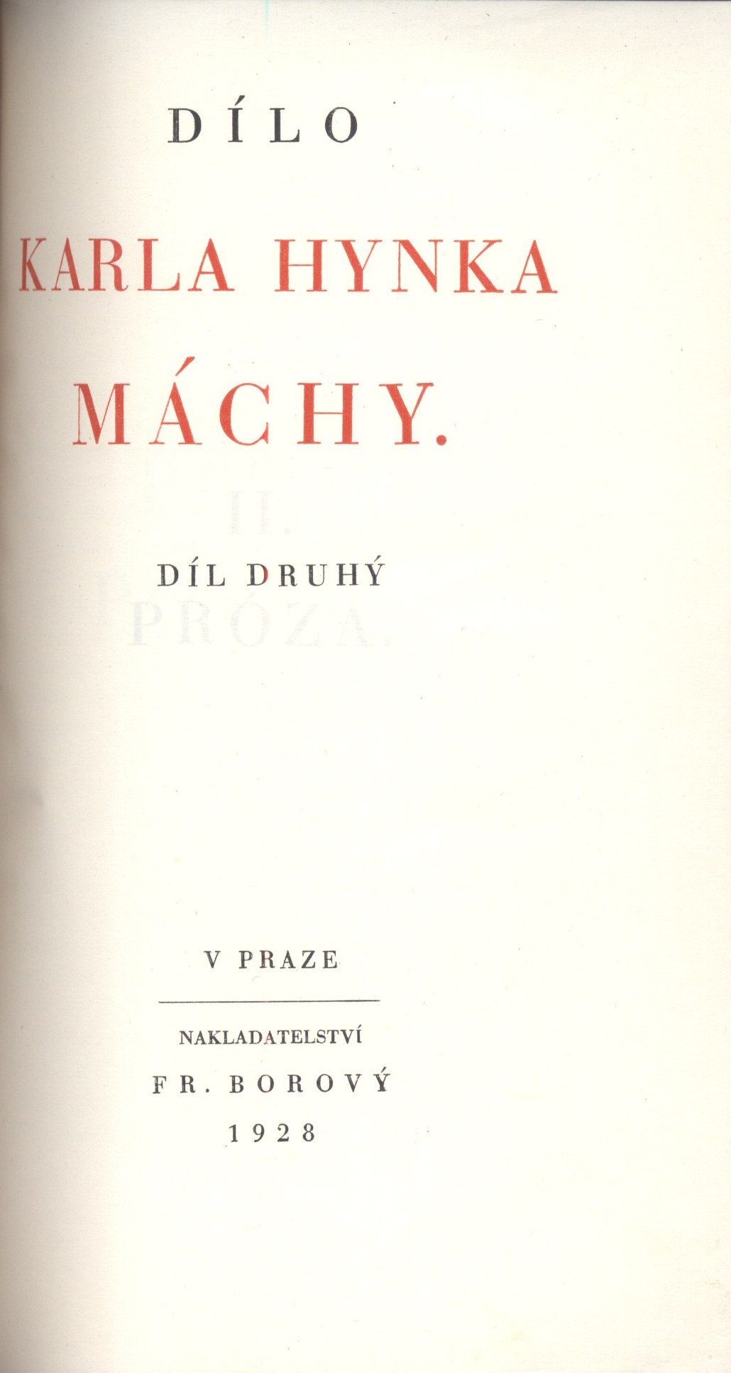 Pantheon, vzorná vydání spisovatelů domácích i cizích, (Fr. Borový) Dílo, Karel Hynek Mácha (Fr. Borový)Country Czech Republic Language Czech * German Note Grafická úprava Cyrila Boudy